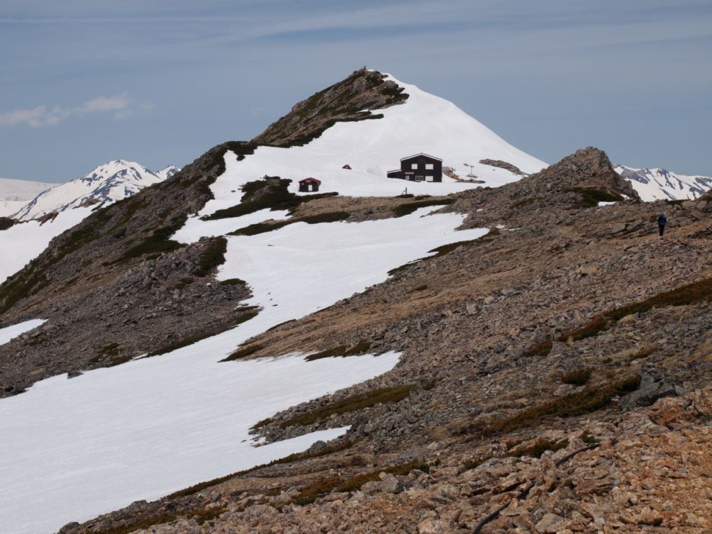 それからしばらく、眼の前に大天井岳とその肩にある大天荘が見えてきた。ここで一休みをと思っていたら、この時期はまだ雪深いせいか残念ながら閉鎖中でした。