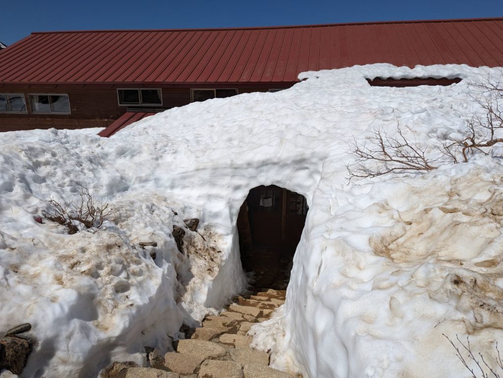 常念小屋の入口はまだこんな感じでがっつり雪に覆われていて、ここ最近の暖かさでおそらく相当溶けたものと思うものの、いかに雪深い場所なのかがわかる。