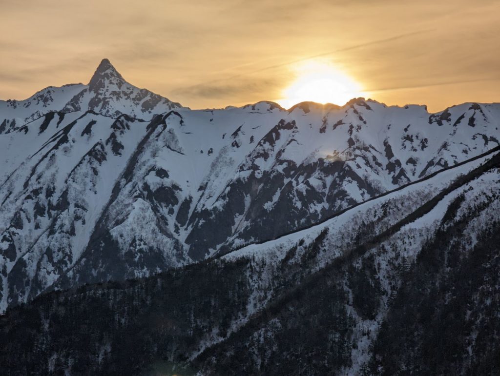 もしかすると夕陽が槍ヶ岳を赤く染めたりするかなと期待をしていたものの、残念ながらちょっとそんな風にはならず。とはいえ、夕陽が北アルプスの山々の向こうに落ちていくさまはとても綺麗。本当は星空をみたいなと思っていたのですが、眠気にはどうにも勝てず…