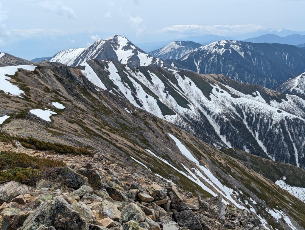 岩礫の道の上りは一の沢の雪渓の上りで疲れ切った足にはかなり大変ではあるものの、景色の素晴らしさは、本当に疲れを忘れてしまうほど。