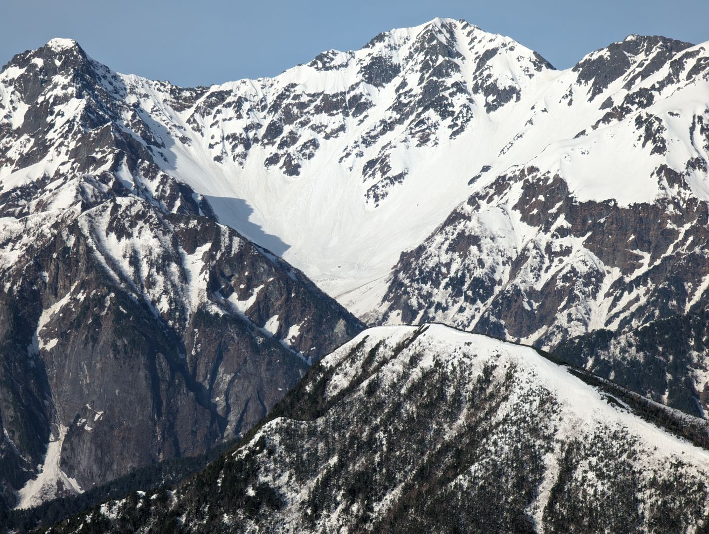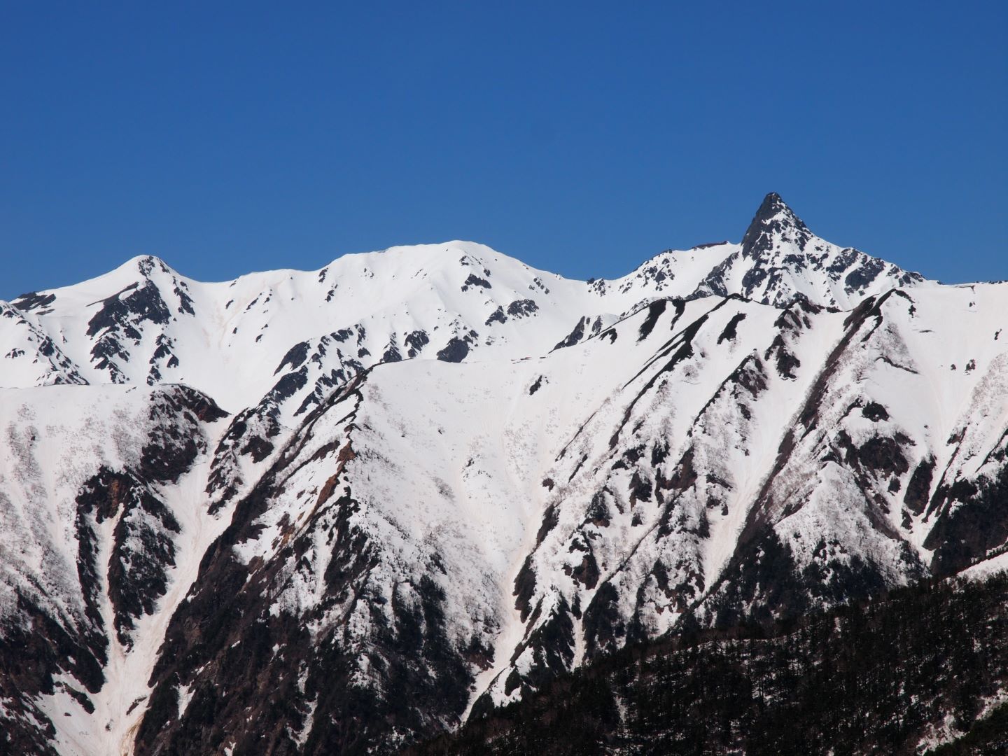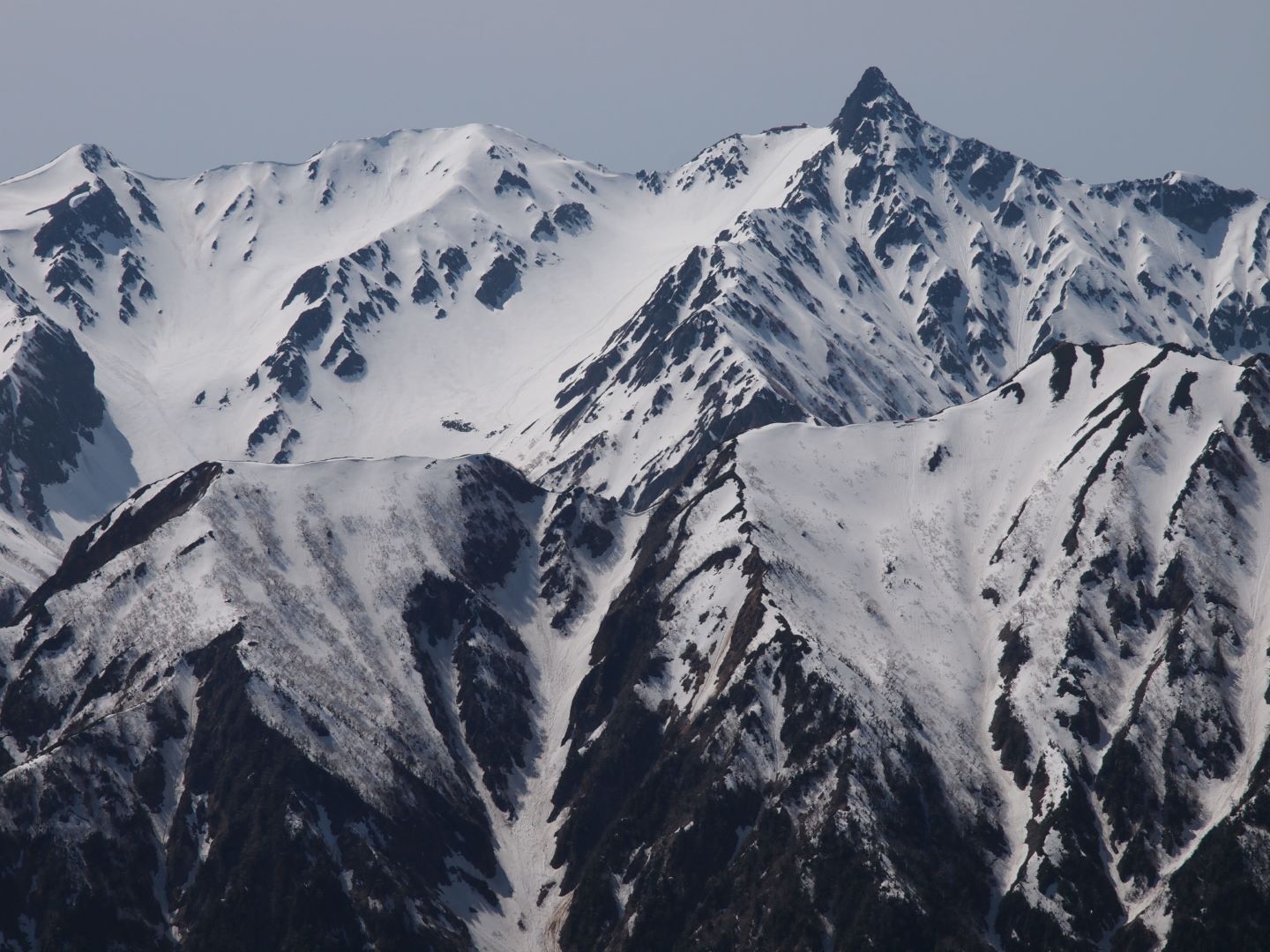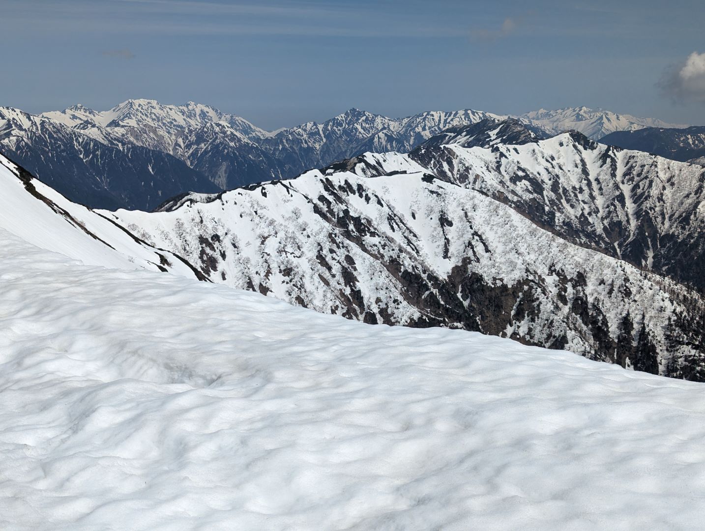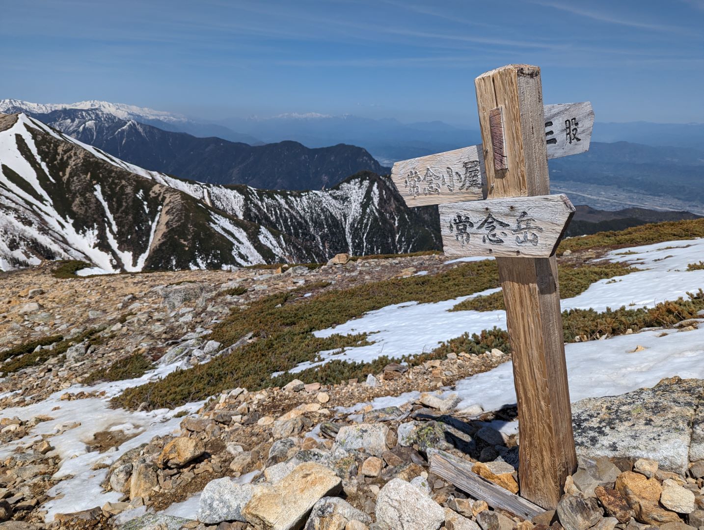 常念岳山頂からの 360度の大展望は、本当に忘れがたい素晴らしい景色で、北アルプスに何度も来たくなるという登山者が多いのもよく分かる。自分の場合は、真っ青な青空と真っ白な雪と、雪が被っていない黒い部分のコントラストの美しさに思わず何度もため息が出るほどで、しばし山頂の絶景を楽しんでいました。