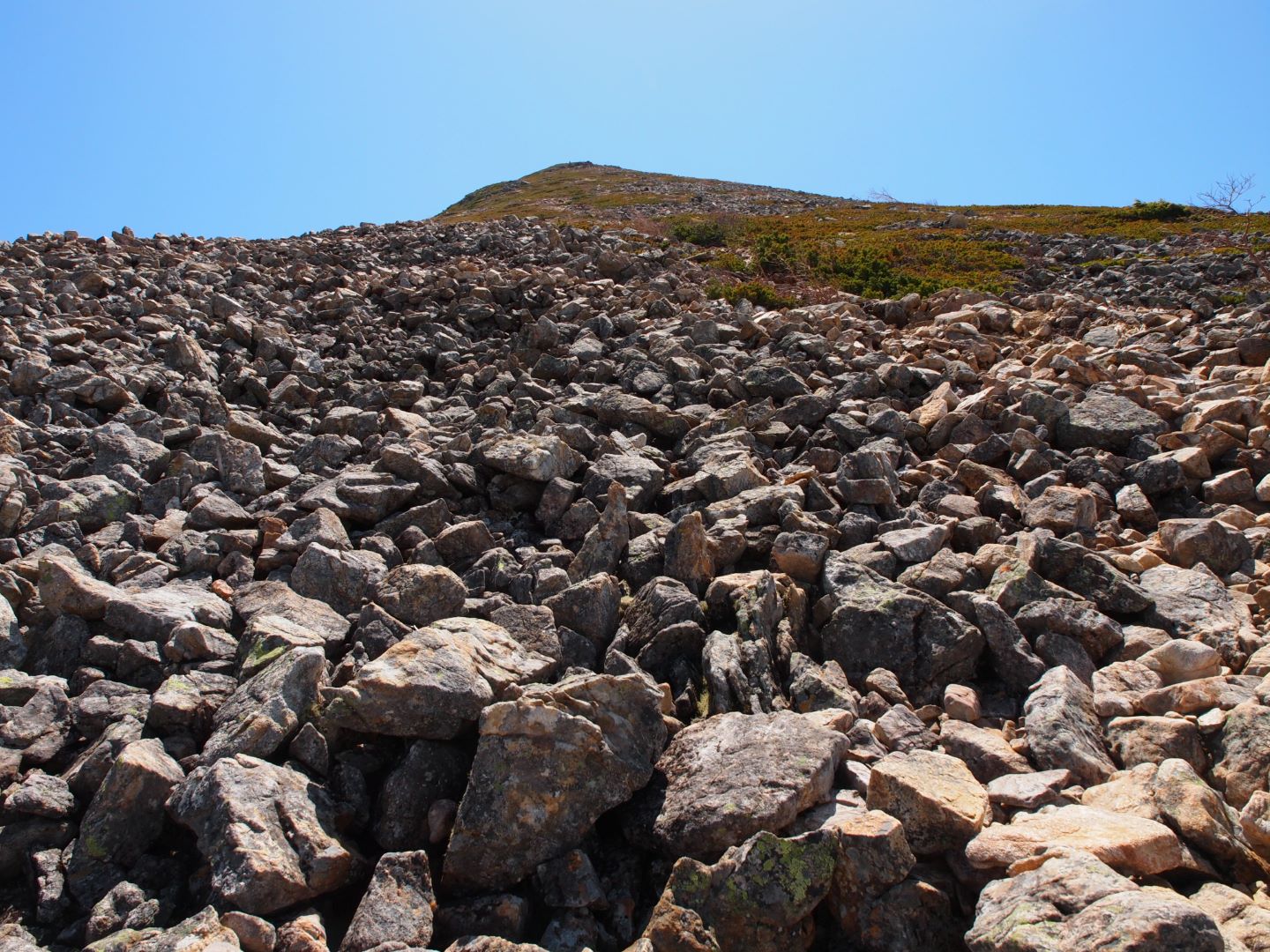 岩礫の道の上りは一の沢の雪渓の上りで疲れ切った足にはかなり大変ではあるものの、景色の素晴らしさは、本当に疲れを忘れてしまうほど。