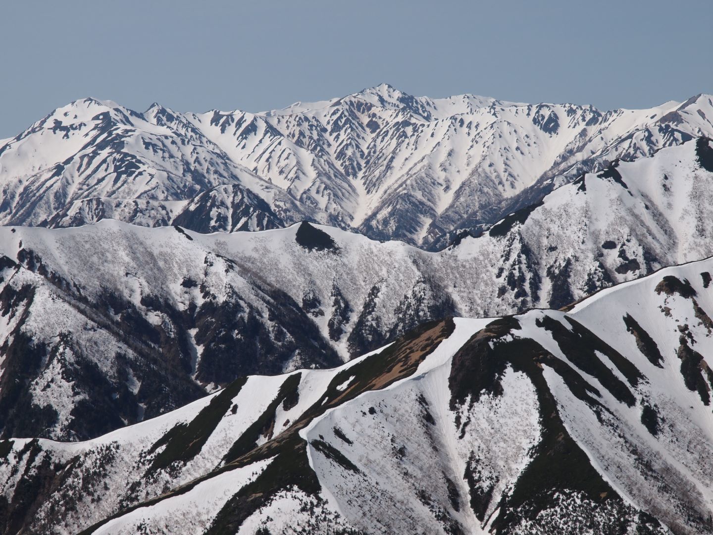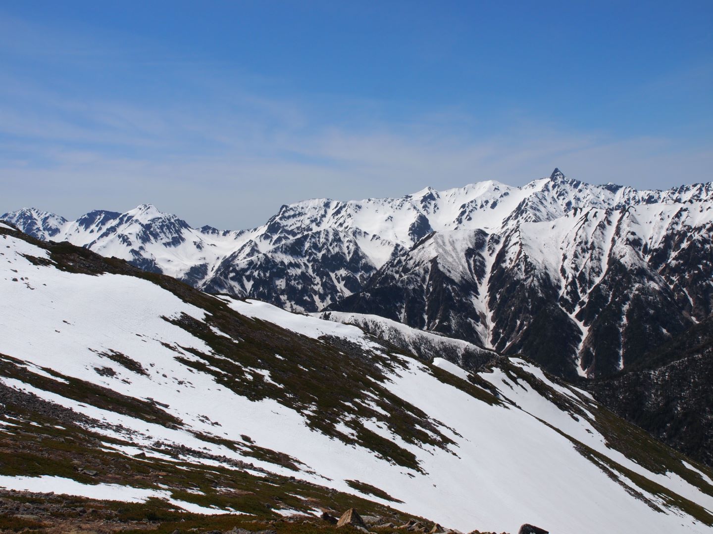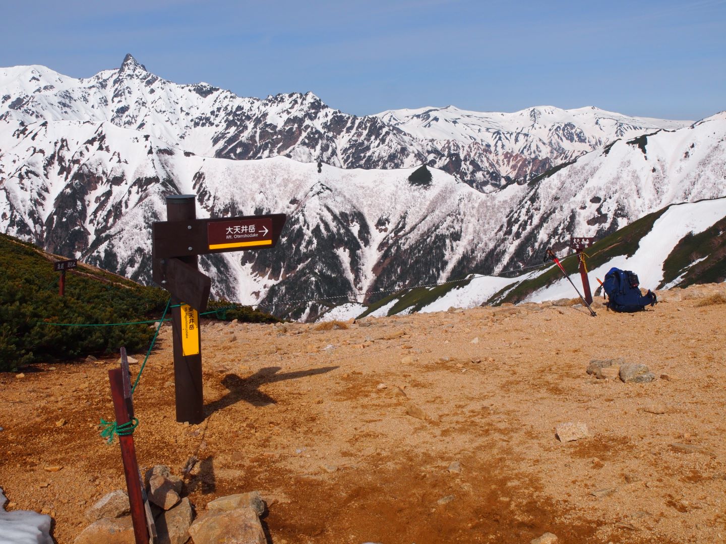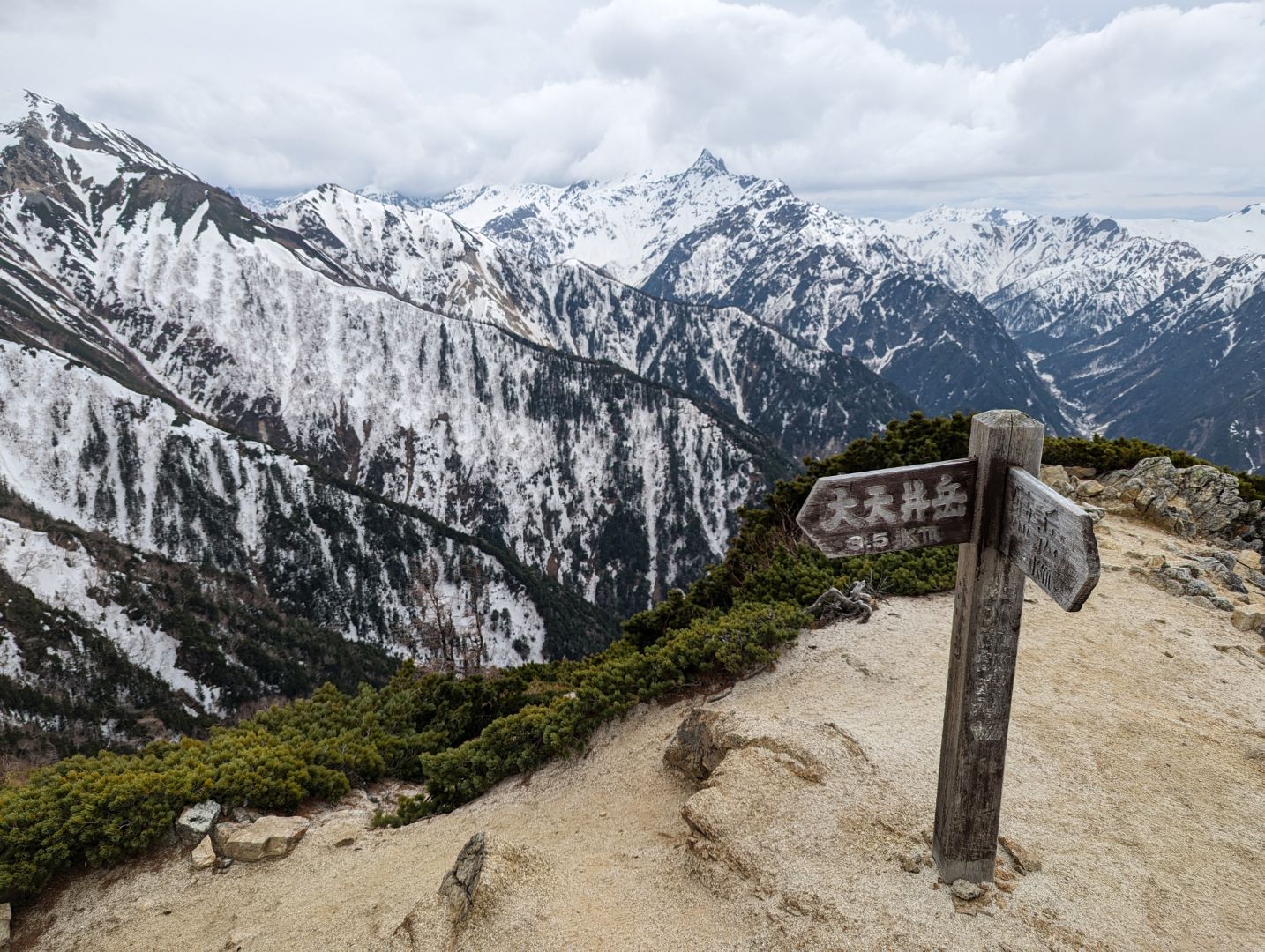 大天荘は実際かなりの部分がまだ雪に埋もれていて、そこから大天井岳への上りもかなりの積雪。やっとの思いで到着した大天井岳山頂からの眺めはやはり素晴らしく、誰もいない中で景色を独り占めして楽しみました。