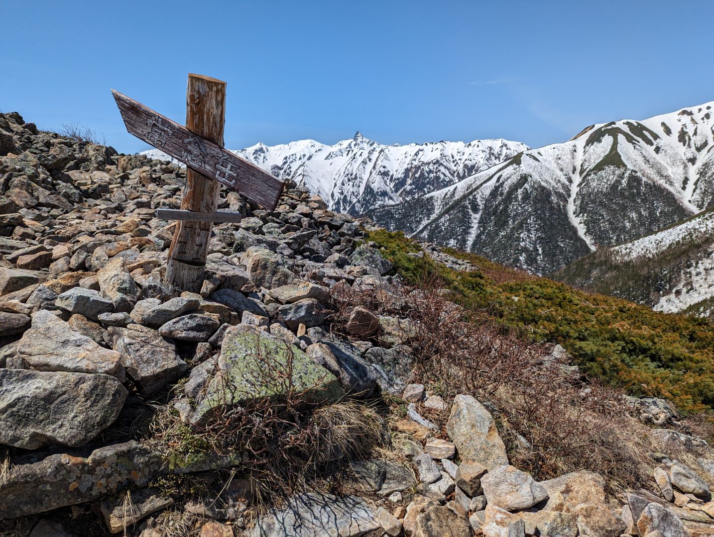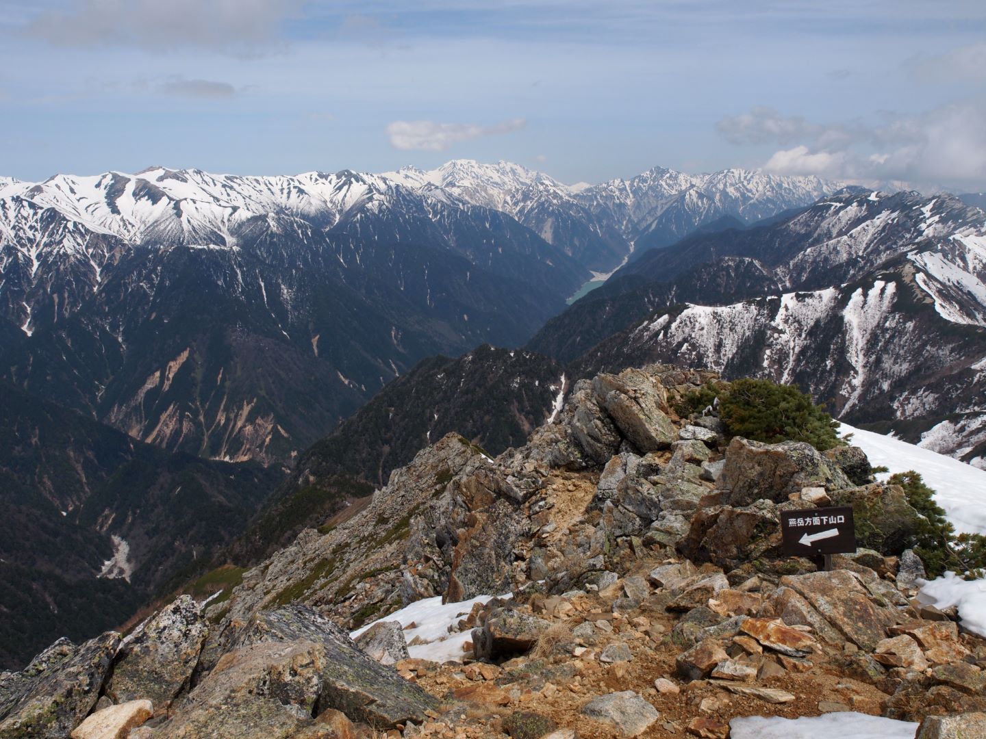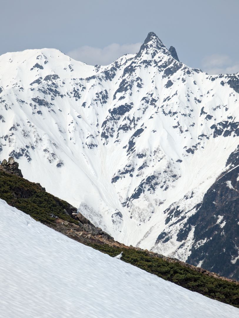 常念小屋からは、横通岳山頂を避けてトラバースする道もあるのだけれど、やはり山頂まで来たのは正解でここも眺めが本当に素晴らしい。また人がほぼ皆無で静寂の中で一人でこの景色を楽しめたというのも大きい。実際、前日の常念小屋では、今日燕山荘に向かうと話をした際に、この時期に向こうまで行けるの?という人もいた位で、この時期のこの道は登山者が極端に少ないみたい。