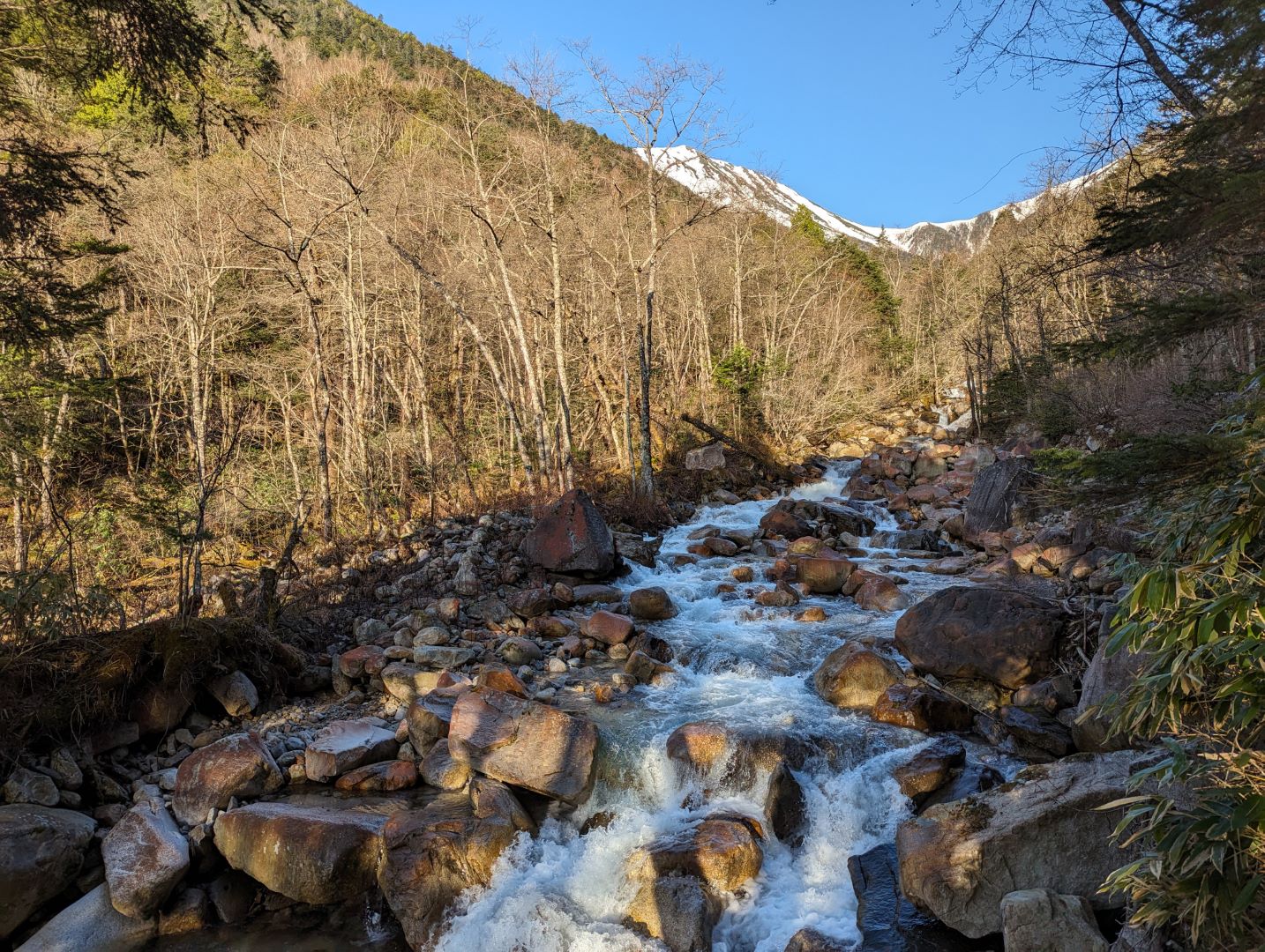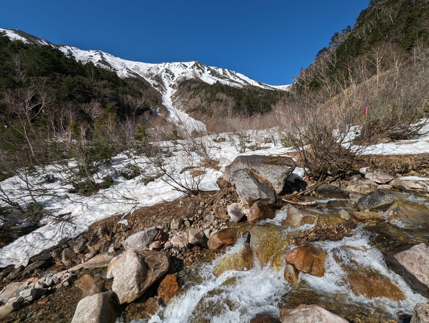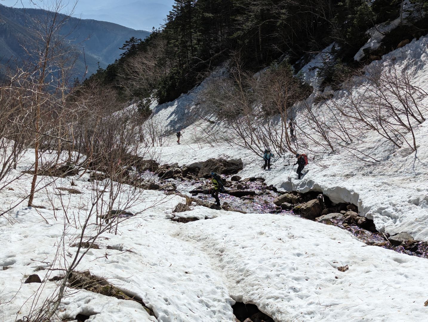 この時期の登山では、渡渉が必要な場所がいくつかあって、そこそこ流れも早い状態なので注意が必要。実際、年配の女性が足を取られて倒れそうになったのを目にしたりしたこともあり気が抜けない。