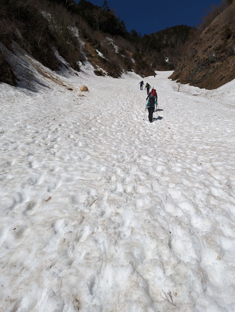眼の前に随分と上の方まで続く雪渓が見えてきて、ここでアイゼンを装着。この晴天で雪はだいぶ緩んでいる上に急斜面ということもあって、アイゼンをしていてもズルズルと滑ってなかなか大変。