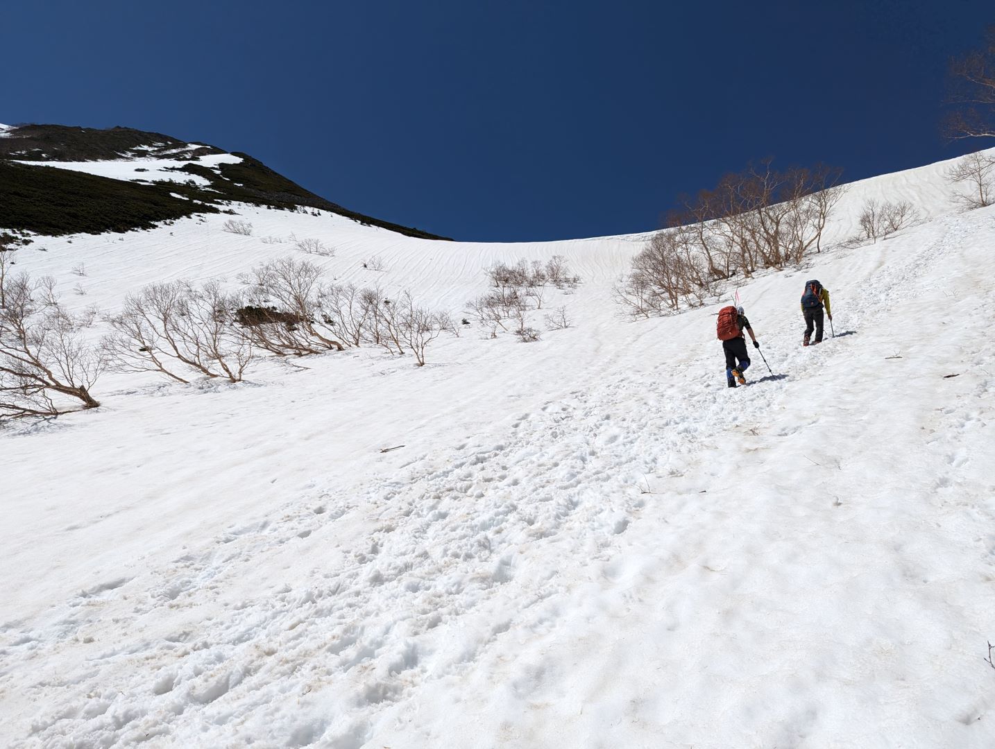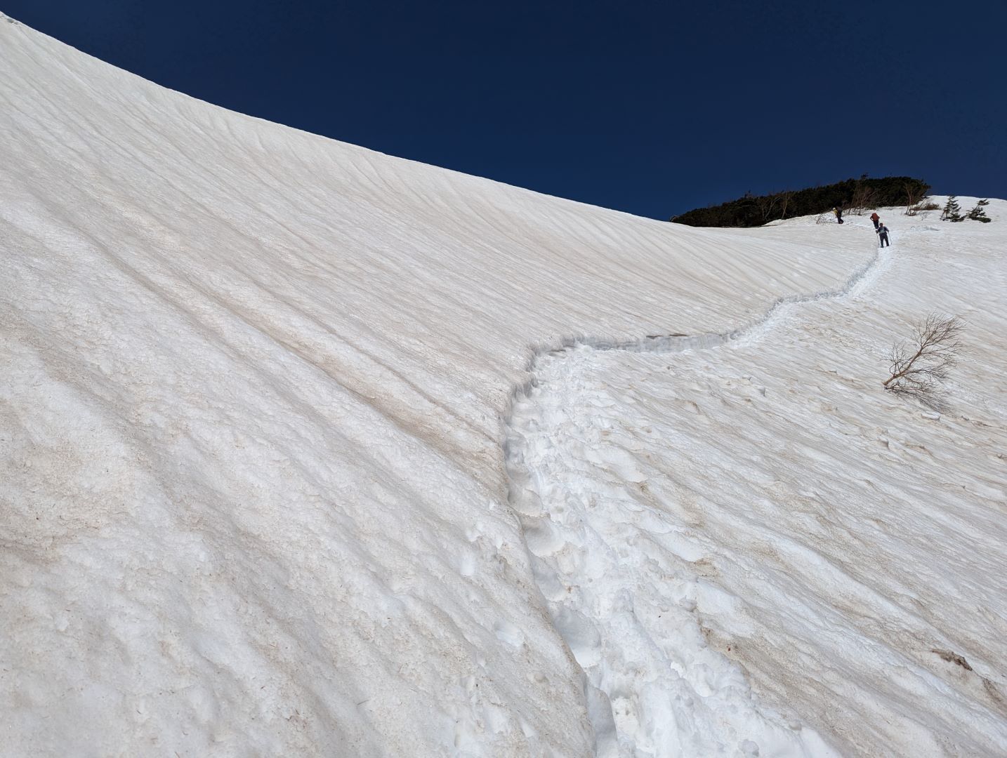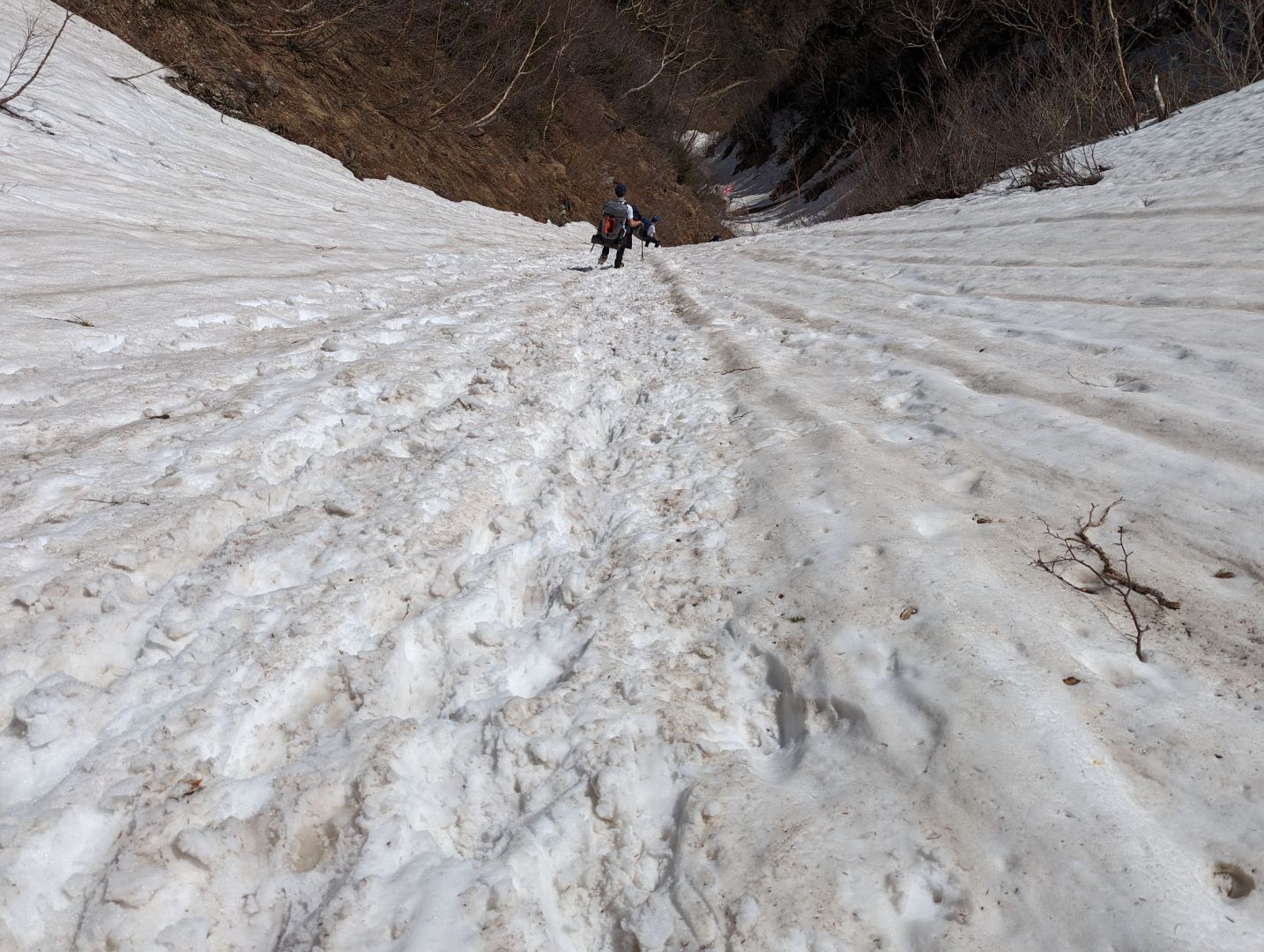 上から降りてくる人たちが、かなり注意深く降りているのが気になって振り返ってみると、相当な急斜面であることが改めて認識できる。雪が緩んでアイゼンでもいまいちグリップが無いので、下りは結構怖いだろうな…