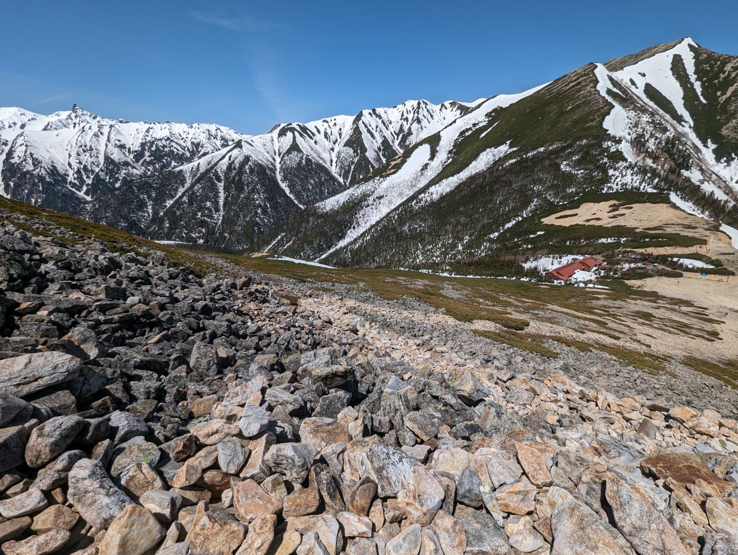 頑張って急な雪渓を登りきると、突然眼の前が開けてこの景色が飛び込んできて、思わず「おーっ」と声が出てしまいました。赤い屋根の建物は今日宿泊する常念小屋で、その向こうにはよく見ると槍ヶ岳の穂先も見えて感動…すごい場所だ。