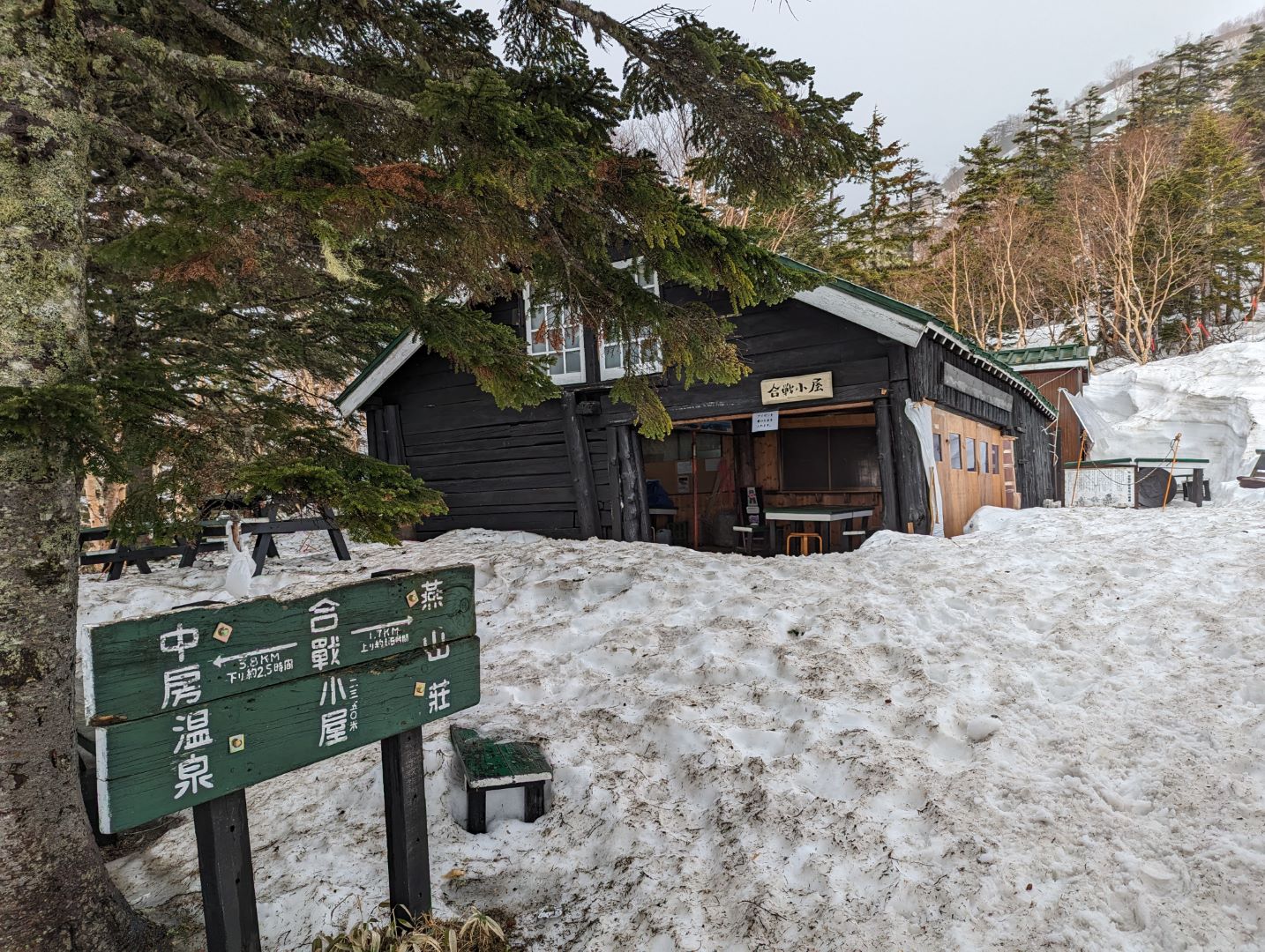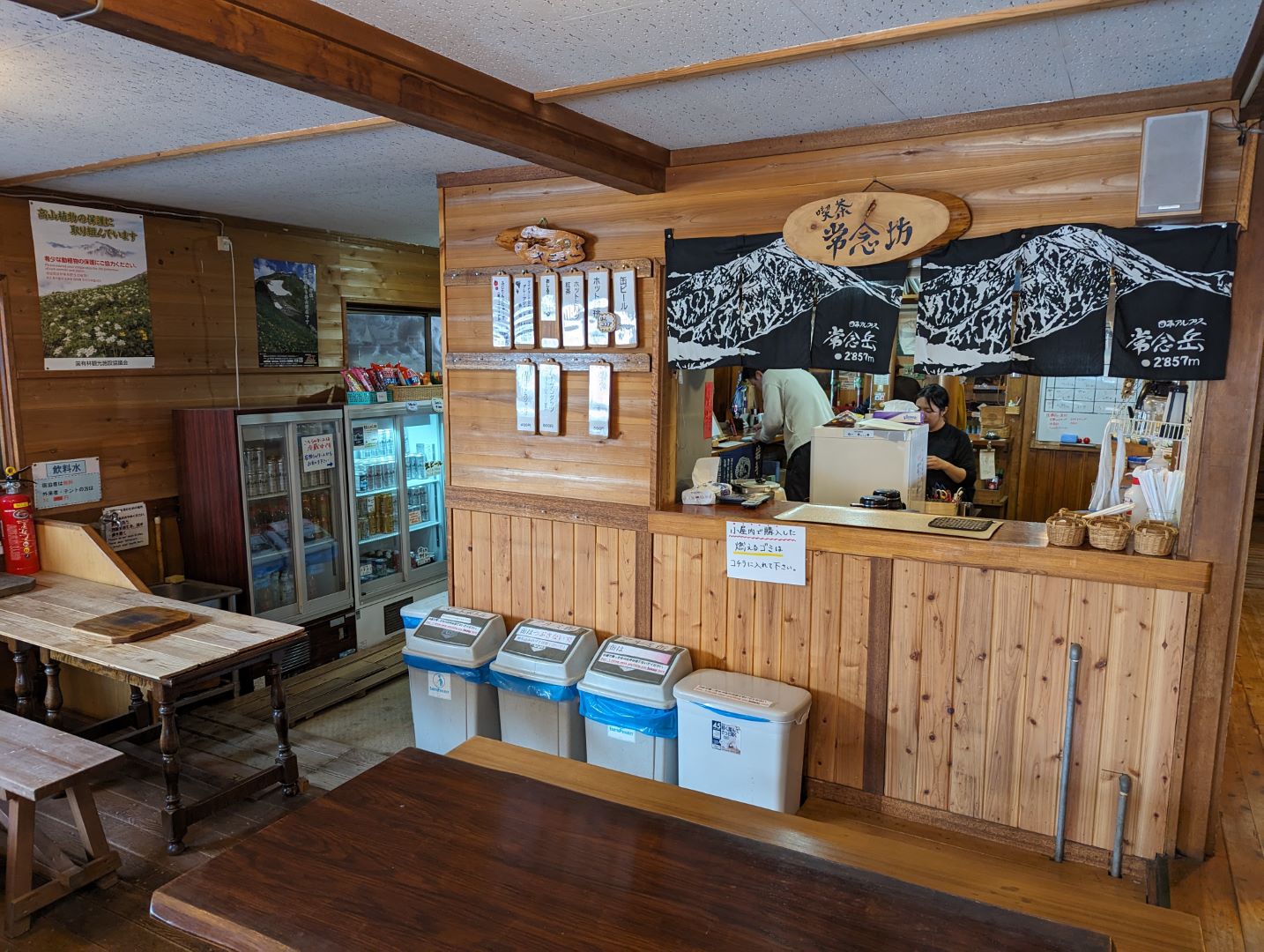 玄関部分は、おそらく外で見た大量の雪が残ったままということもあって、潰れないように何本かの柱で支えているようなのが印象的。常念岳山頂に登る前に受付は済ませてあって、荷物もある程度デポさせて頂いていたのでした。