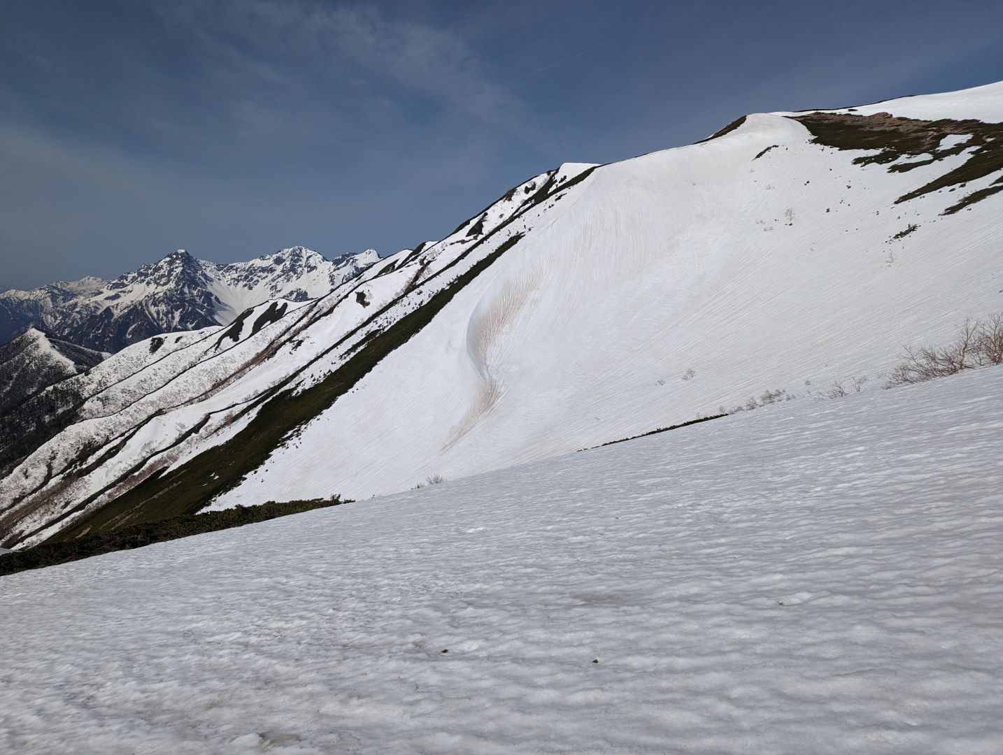 横通岳から先はだいぶ雪の量が増えてきて、アイゼンをつけるほどではないけど、チェーンスパイク欲しいなという感じの道が…アイゼンを持ってきたので、チェーンスパイクは荷物減らすために持ってこなかったのが痛い。