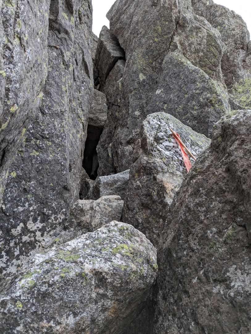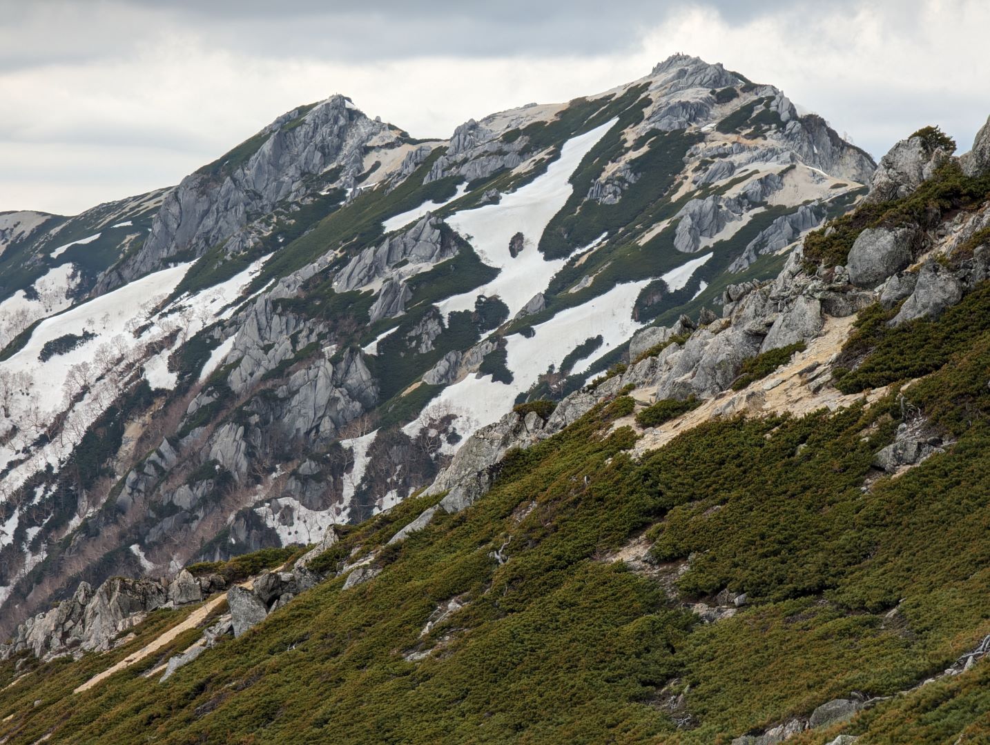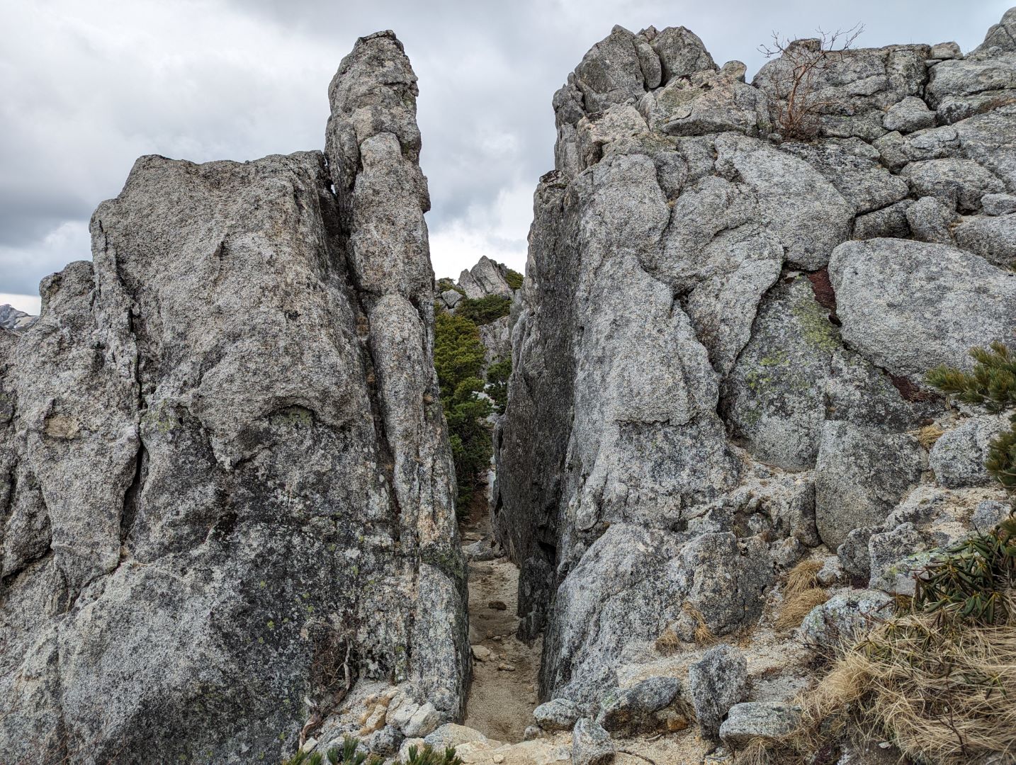 蛙岩も一体どうすればよいのかしばらく考え込んでしまった場所。実際、写真の真ん中の恐ろしく狭い空間を反対側から抜けてきたのだけれど、夏道は雪がなく滑落の心配もないので、これを通らず巻いて抜けるみたい。雪が残るこの時期は、この狭い穴を抜けるので荷物含めて大苦戦…