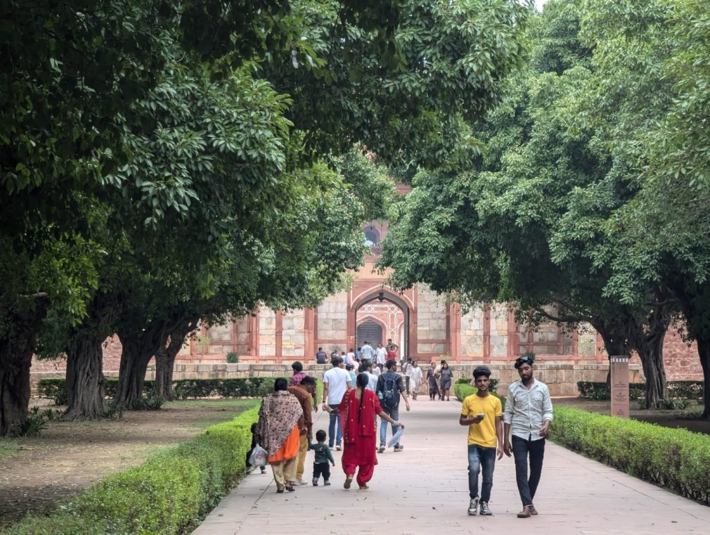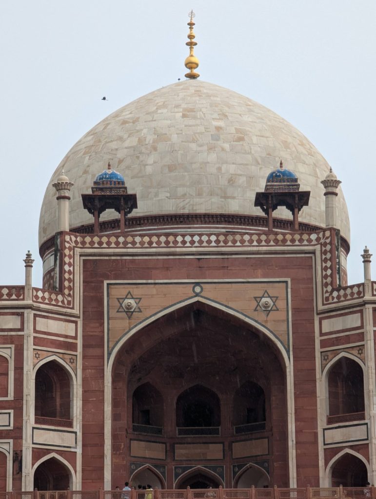 入口から入ってフマユーン廟に向かって歩いてしばらく、右手に丸くて青い装飾屋根が独特な比較的小さな建物が見えてくる。説明によるとこれは1547年に建てられたイサ・カーンという人のお墓とモスクで、彼が存命の間に建てられたものでフマユーン廟に20年先立って建てられたものなのだとか。近づいてゆっくり見たいところだったのですが、真っ黒なヤバそうな雲が近づいていて傘も持っていなかったので急いでフマユーン廟の方へ。