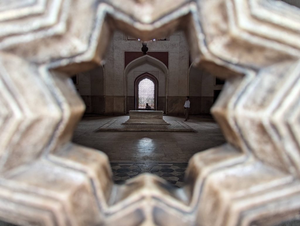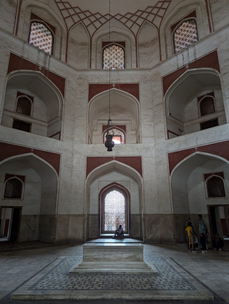 門をくぐると、シンメトリーで赤い砂岩と白い大理石のコントラストが非常に美しい建物が目の前に。ムガル帝国第2代皇帝フマユーンのためにその妃が 1565年に建造したもので、地図を見ると正方形に美しく区画された中心に廟が置かれていて、東西南北どの方向から見ても同じようなシンメトリーの形状をしたとても美しい建物。