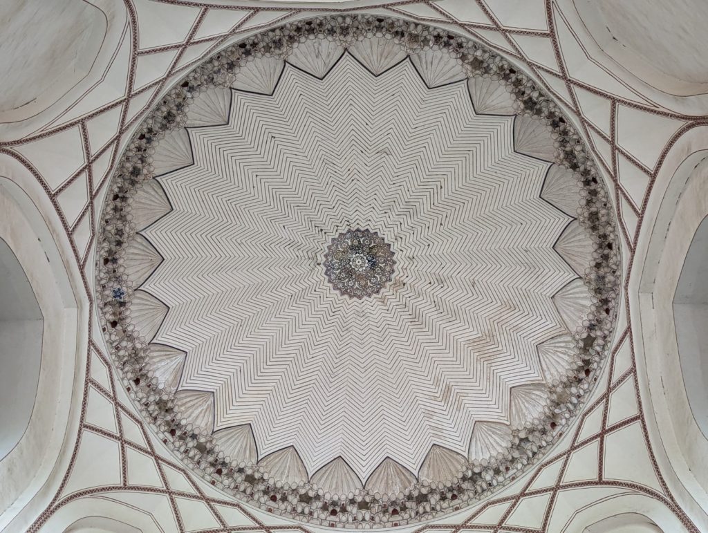 建物の方だと、外から見た対称性だけでなく、入口の天井にはこれほどに壮麗で細かくシンメトリーな模様が施されているわけで、やっぱり不思議。