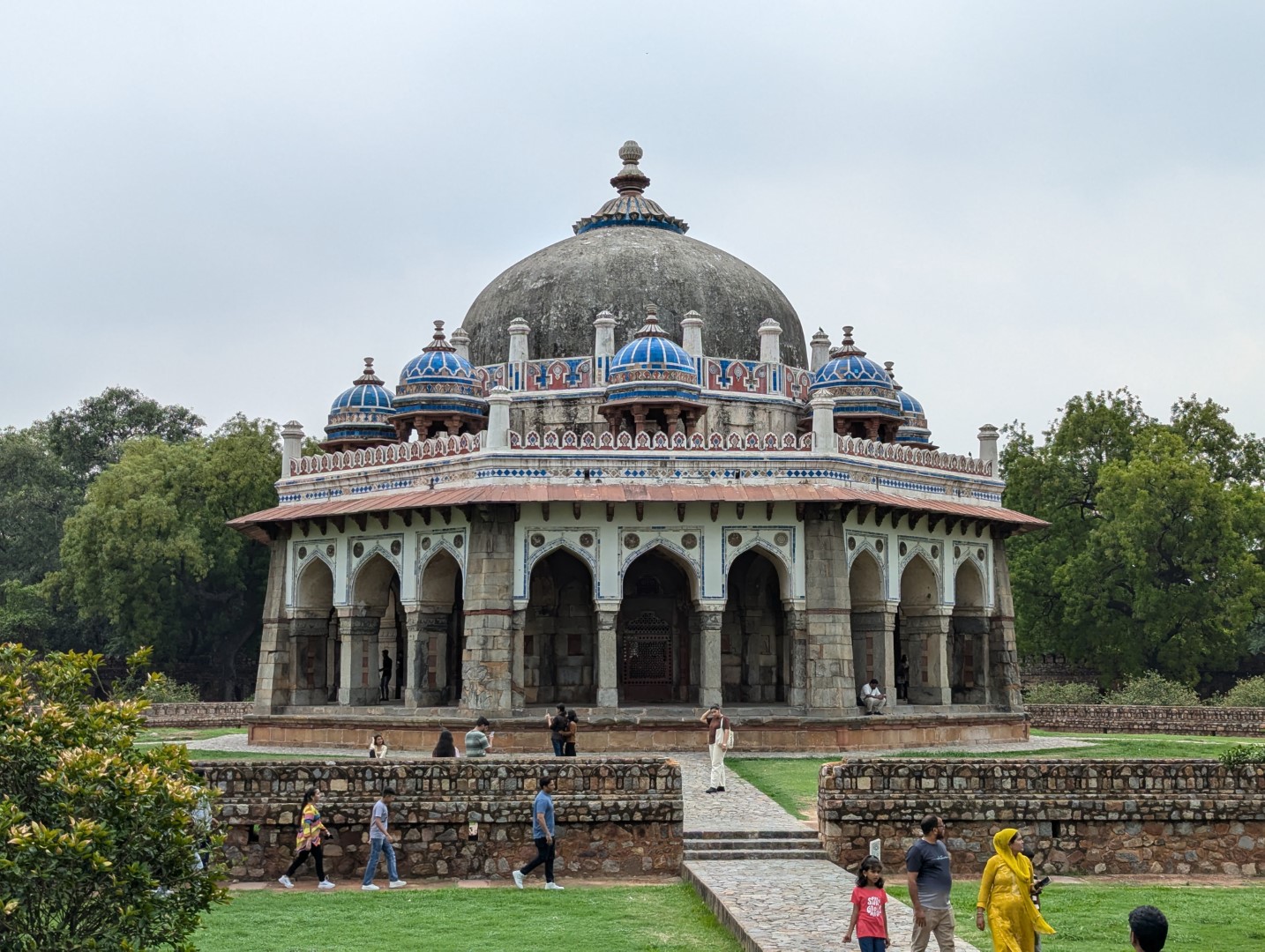 入口から入ってフマユーン廟に向かって歩いてしばらく、右手に丸くて青い装飾屋根が独特な比較的小さな建物が見えてくる。説明によるとこれは1547年に建てられたイサ・カーンという人のお墓とモスクで、彼が存命の間に建てられたものでフマユーン廟に20年先立って建てられたものなのだとか。近づいてゆっくり見たいところだったのですが、真っ黒なヤバそうな雲が近づいていて傘も持っていなかったので急いでフマユーン廟の方へ。