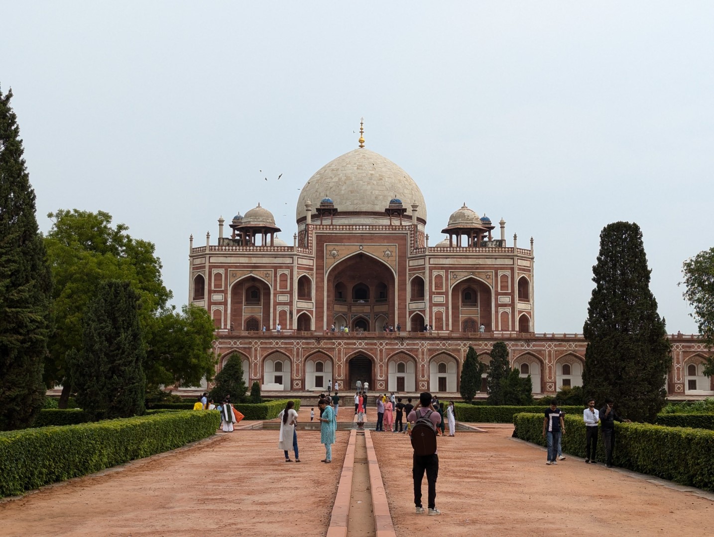 門をくぐると、シンメトリーで赤い砂岩と白い大理石のコントラストが非常に美しい建物が目の前に。ムガル帝国第2代皇帝フマユーンのためにその妃が 1565年に建造したもので、地図を見ると正方形に美しく区画された中心に廟が置かれていて、東西南北どの方向から見ても同じようなシンメトリーの形状をしたとても美しい建物。