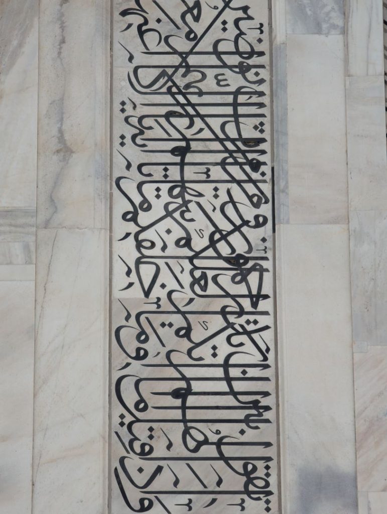 タージ・マハルで驚くのは、このカリグラフィー。よく見ると黒い大理石を白い大理石に象嵌して作られている…この曲線も直線も全く驚くほどの精度で描かれている。