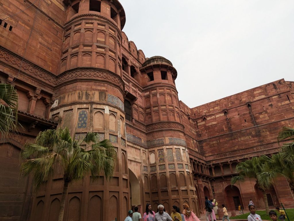 チケット売り場があるアマル・スィン門を抜けるとすぐに見えてくるのが、美しいジャハーンギール宮殿。芝生の緑と赤砂岩の赤色の対比が美しい、きっと晴れて真っ青な空が広がったら更にコントラストが際立って美しいだろうな。