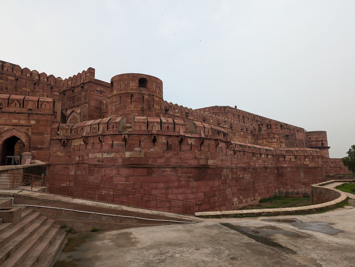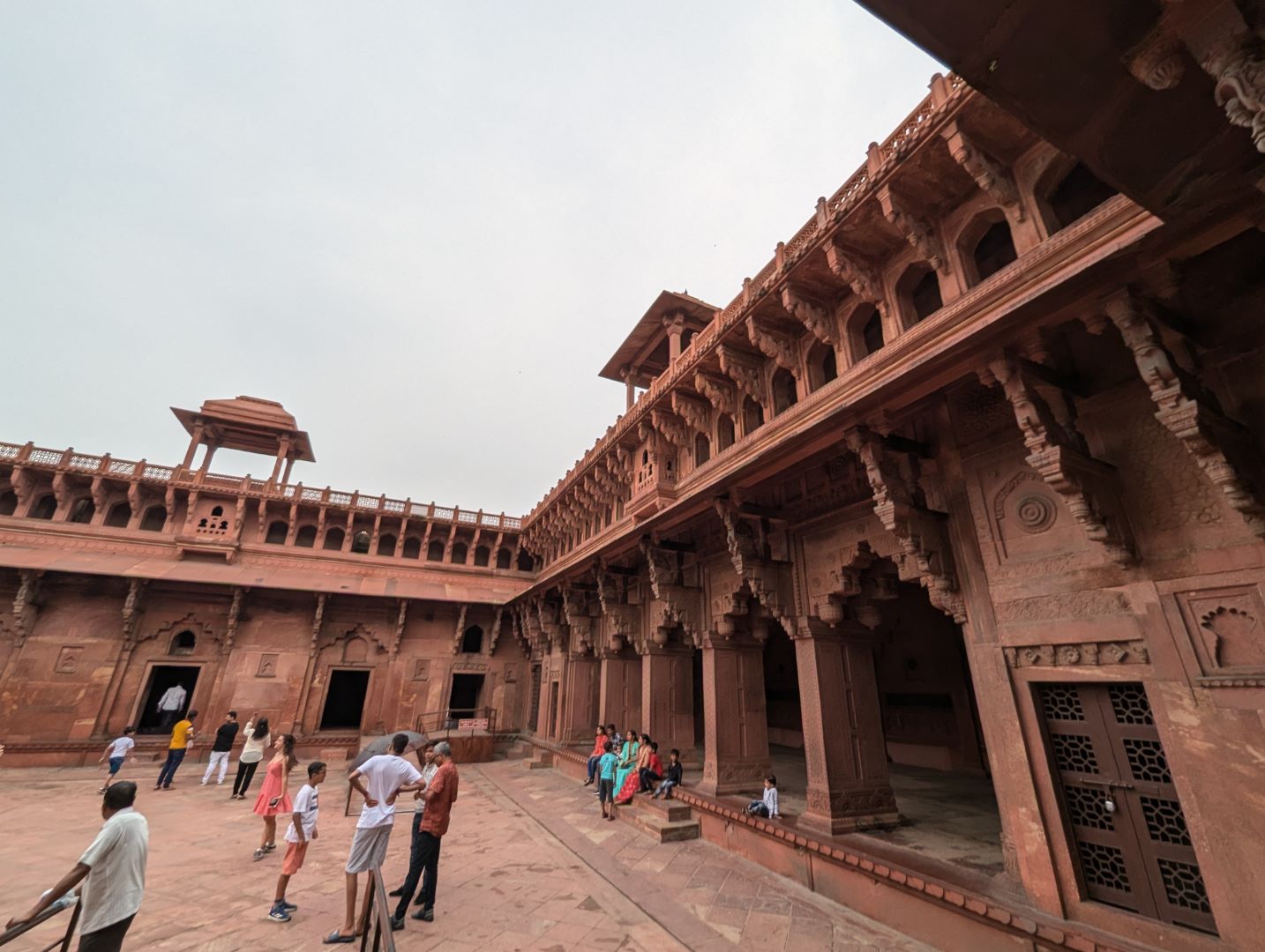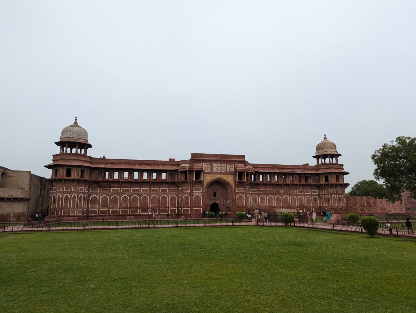 チケット売り場があるアマル・スィン門を抜けるとすぐに見えてくるのが、美しいジャハーンギール宮殿。芝生の緑と赤砂岩の赤色の対比が美しい、きっと晴れて真っ青な空が広がったら更にコントラストが際立って美しいだろうな。
