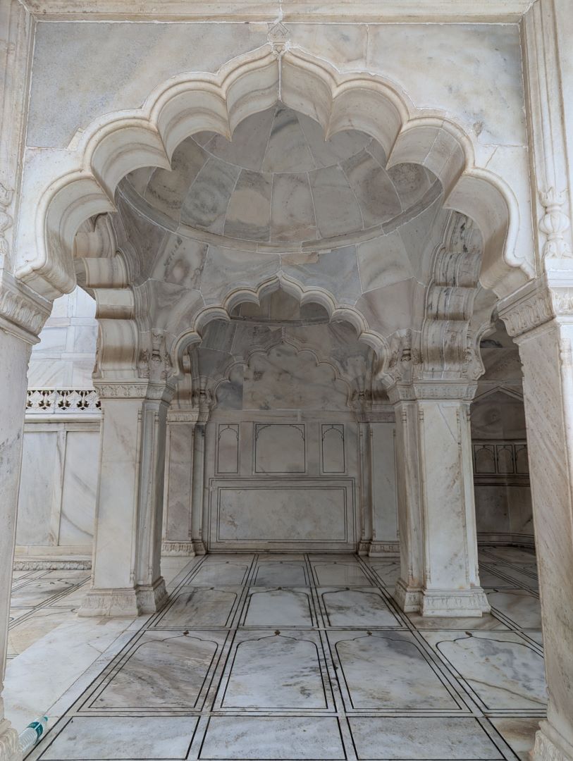 美しいアーチで構成される一般謁見の間は、アクバル帝ではなくシャー・ジャハーンが造ったもので、規則正しく配置された柱とアーチで構成される間。これの中央奥に王である自分が立つことで、視覚的な効果も狙っていそうな雰囲気。