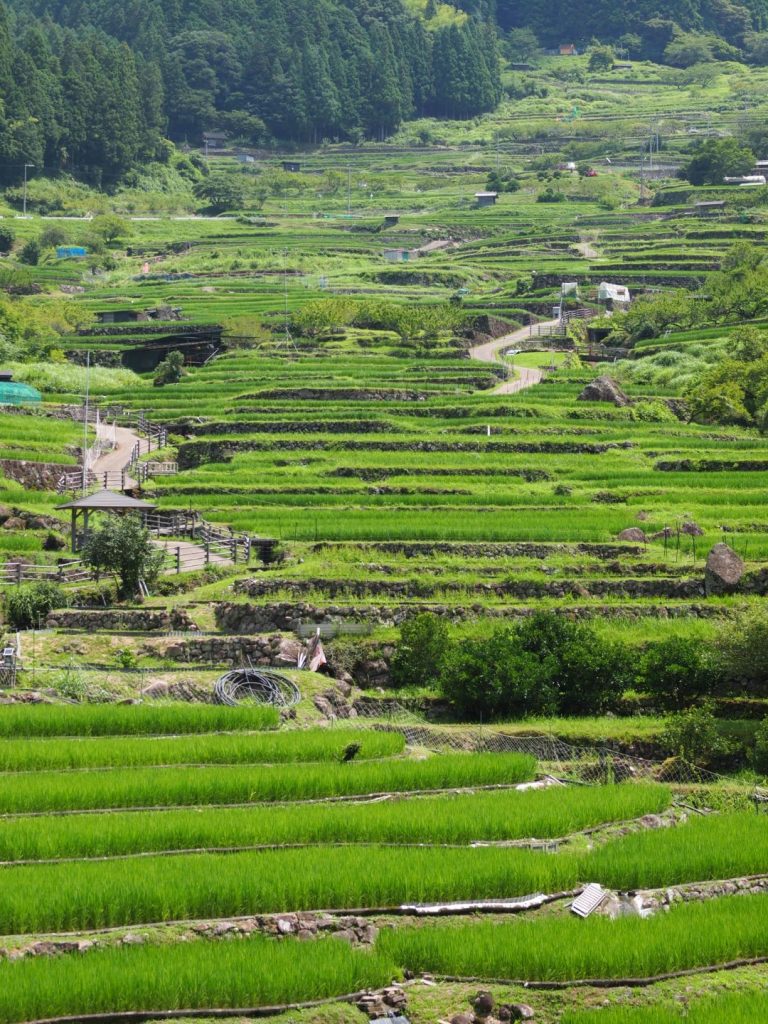 この棚田は、鞍掛山の山麓 標高220メートルから標高 420メートルまで広がっているそうで、現在は 400枚程度の田んぼがあるとのこと(最盛期には約1300枚もの田んぼがあったのだとか)。写真では伝わりきらない気がするけれど、現地で実際に見てみるとかなり広大な棚田になっていて、これを20戸の農家さんが田んぼの面倒を見ているとのことでなかなかの規模だと思う。