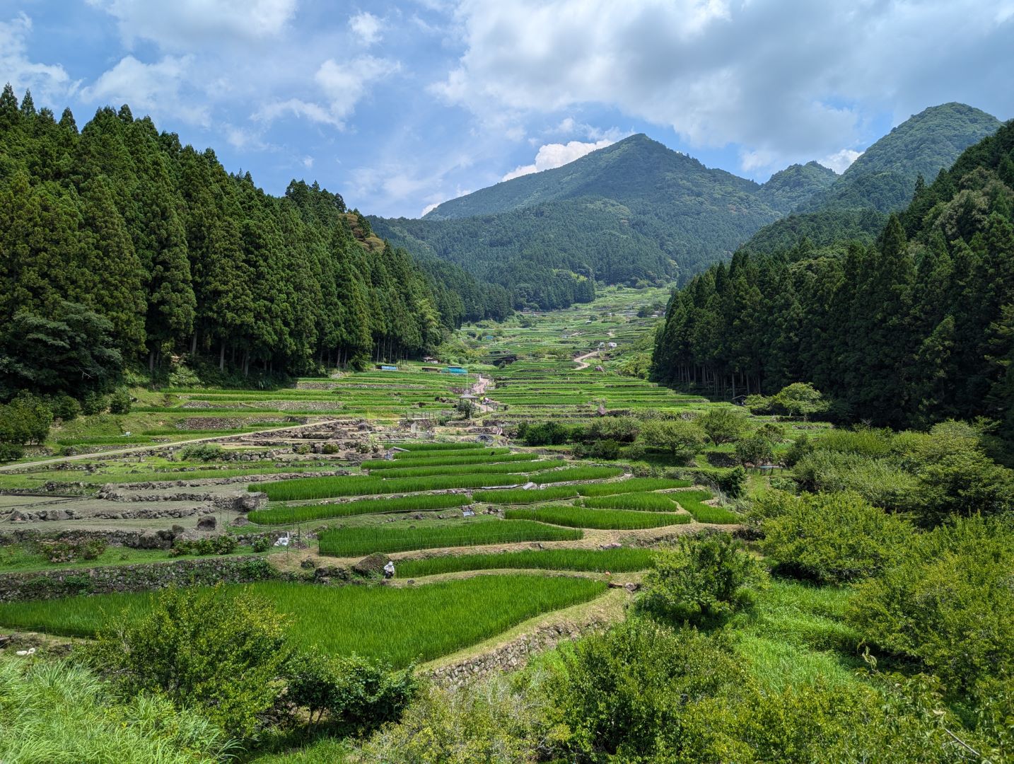 この棚田は、鞍掛山の山麓 標高220メートルから標高 420メートルまで広がっているそうで、現在は 400枚程度の田んぼがあるとのこと(最盛期には約1300枚もの田んぼがあったのだとか)。写真では伝わりきらない気がするけれど、現地で実際に見てみるとかなり広大な棚田になっていて、これを20戸の農家さんが田んぼの面倒を見ているとのことでなかなかの規模だと思う。