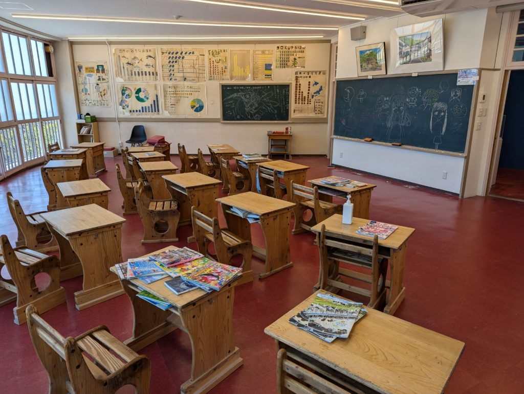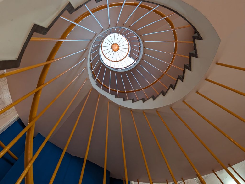 円形劇場、その名の通り円形というか円筒形の不思議な建物で、もともとは学校として使われていたそうで、当時の教室などが展示スペースとして使われています。また、一部教室をそのまま残してある場所があって当時の様子が感じ取れます。この円筒形の建物の中心部分は螺旋状の階段になっていて、各教室は中心から外側に向かって配置される面白い構造をしています。