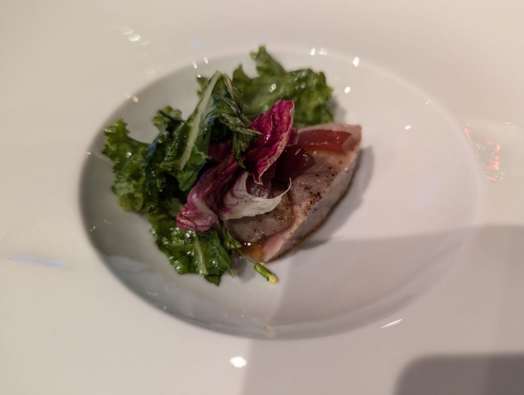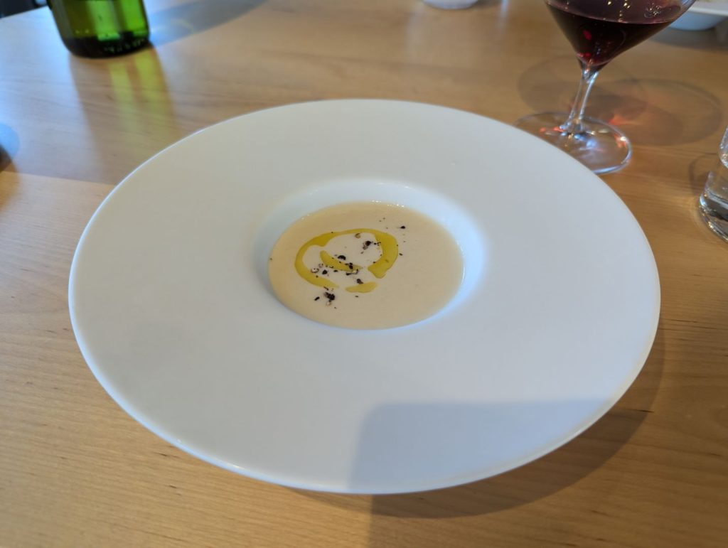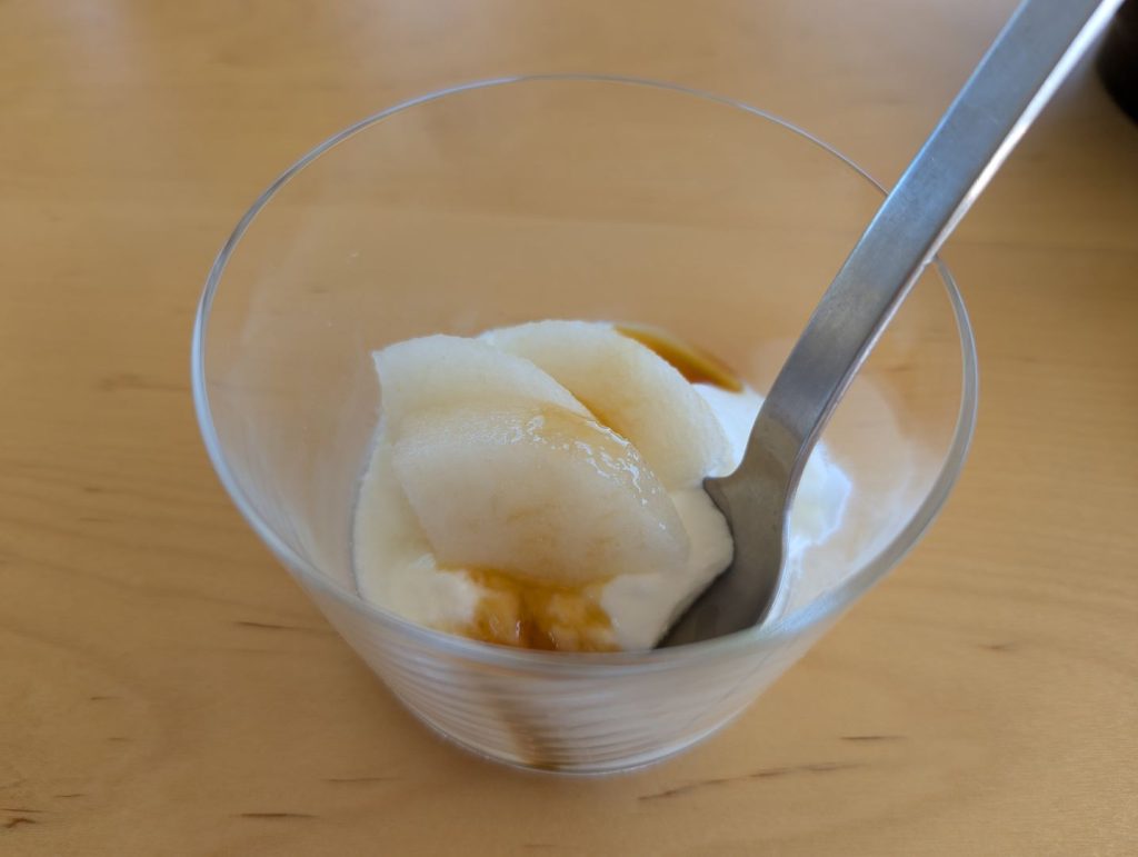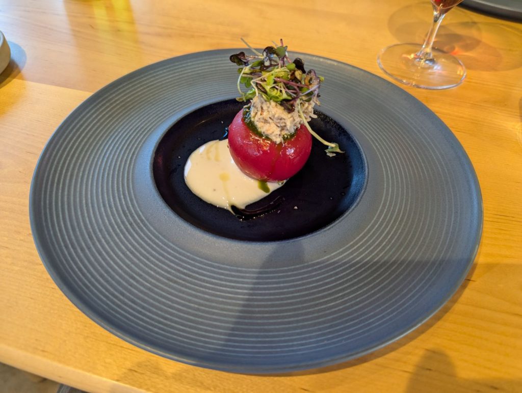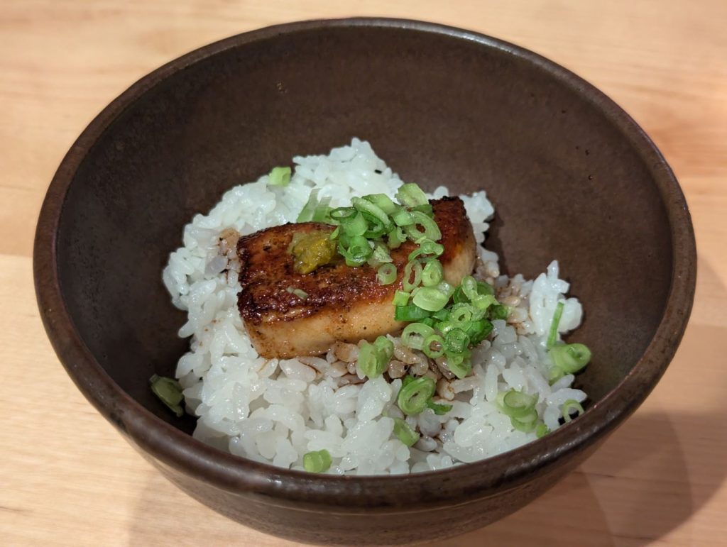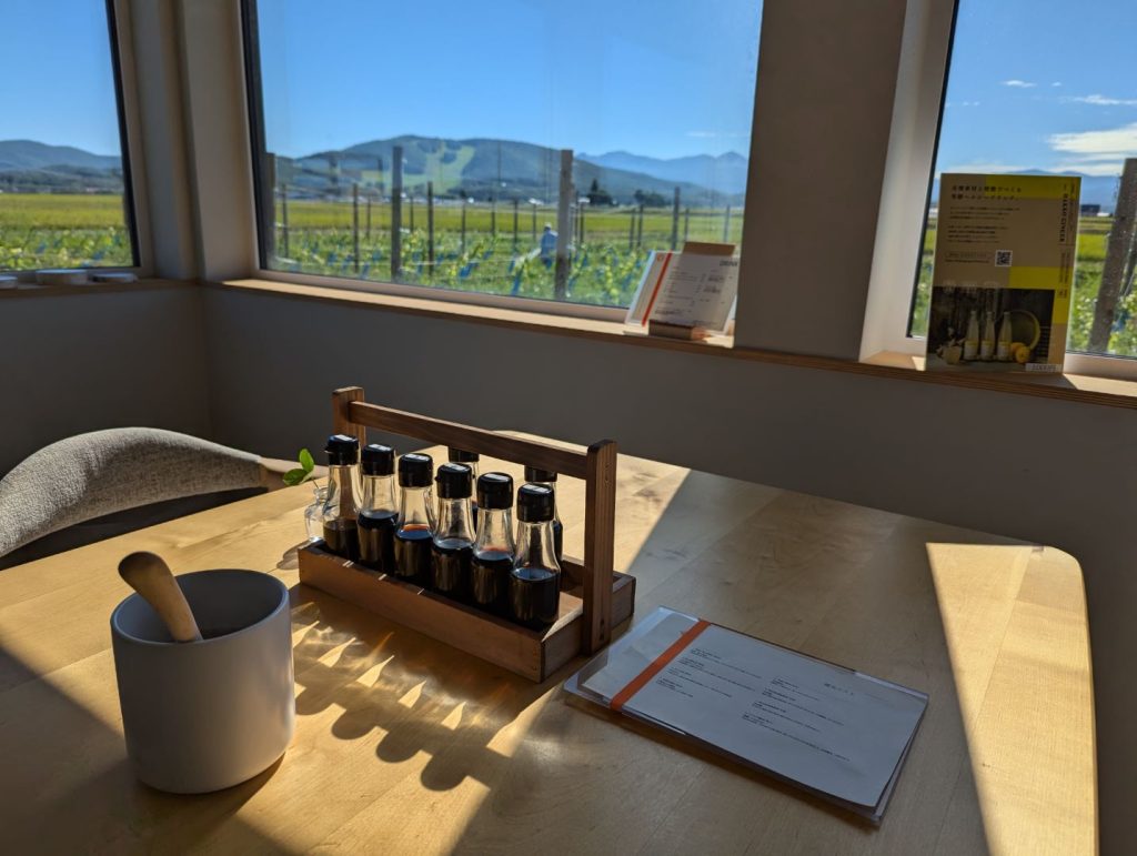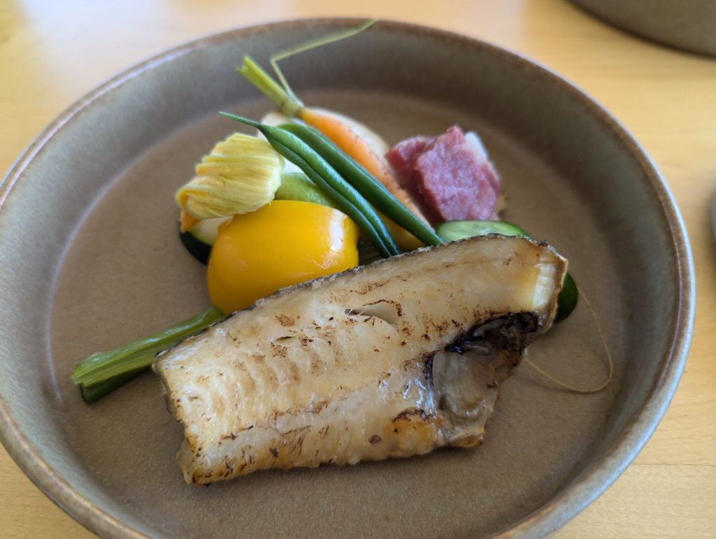 自分たちも移住を考えつつも10年ほど通い続けている東川。オーナー夫妻の佐野さんたちは2023年に移住されて、地元のこだわりの食材やワインを仕入れながら、また自分たちで目の前の畑でブドウも育てて将来的にはワインも作れないかなということも考えながらオーベルジュを始められたのだそう。こだわりの食材について色々とお話をしてくださる中で、自分たちも知っているお店や農場の名前が出てくるとちょっと嬉しくなったりも。また最後に出してくれたフォアグラ丼は、東川に来られる前の広尾のフレンチレストランのペリカンの人気メニューだったそう。