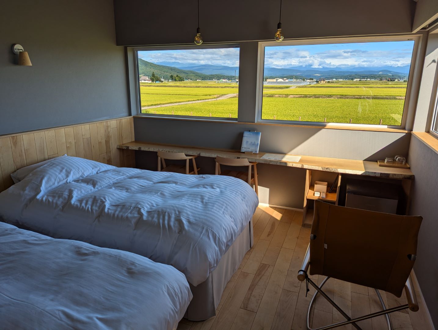 東川町は夏に写真甲子園が開かれるような場所で、街なかでも田んぼと大雪山の景色が美しい場所なのですが、東川ペリカンはそんな田んぼの真ん中にぽつんとあって、部屋の中からも外に出てもその雄大な景色を満喫できます。