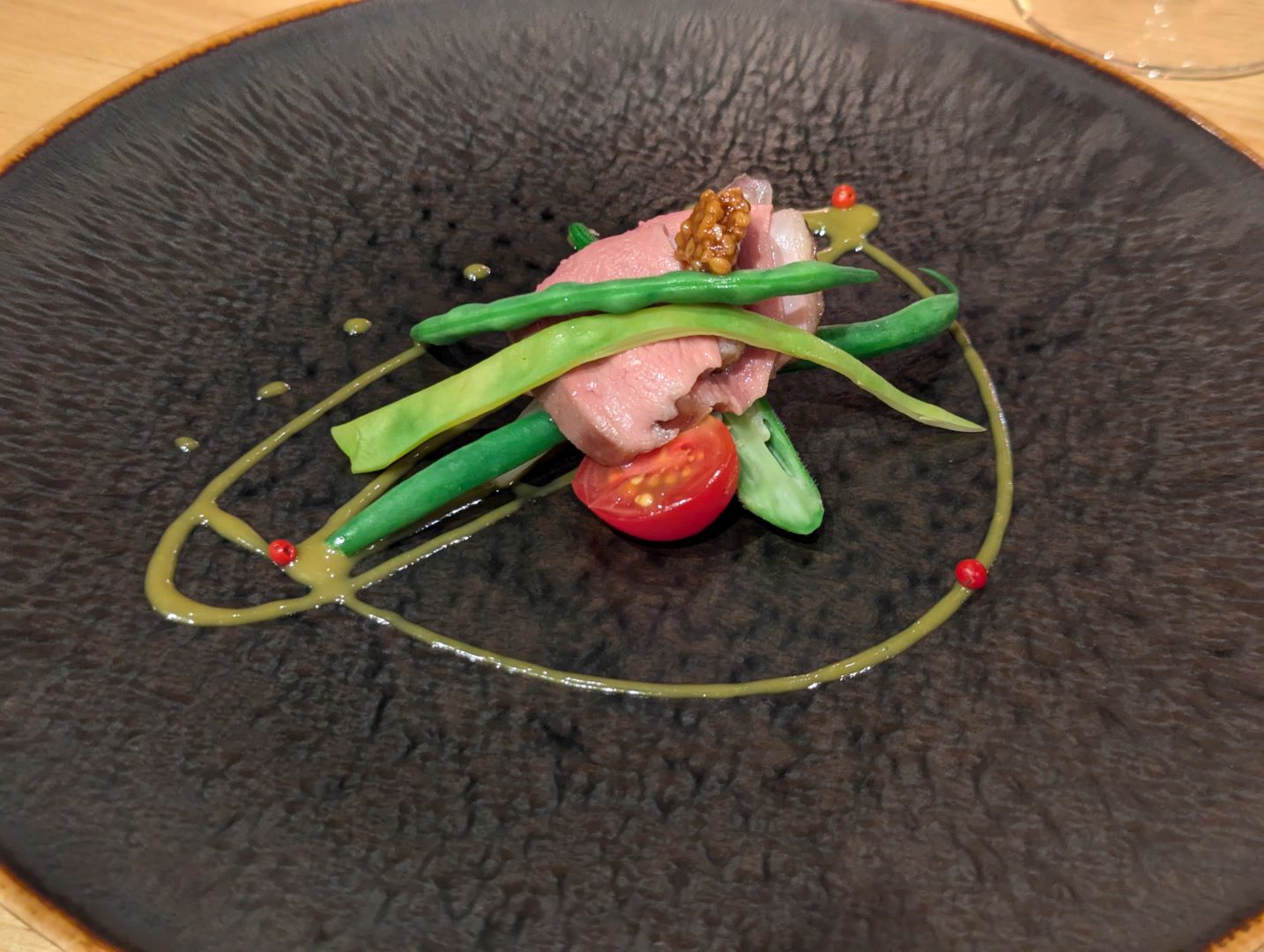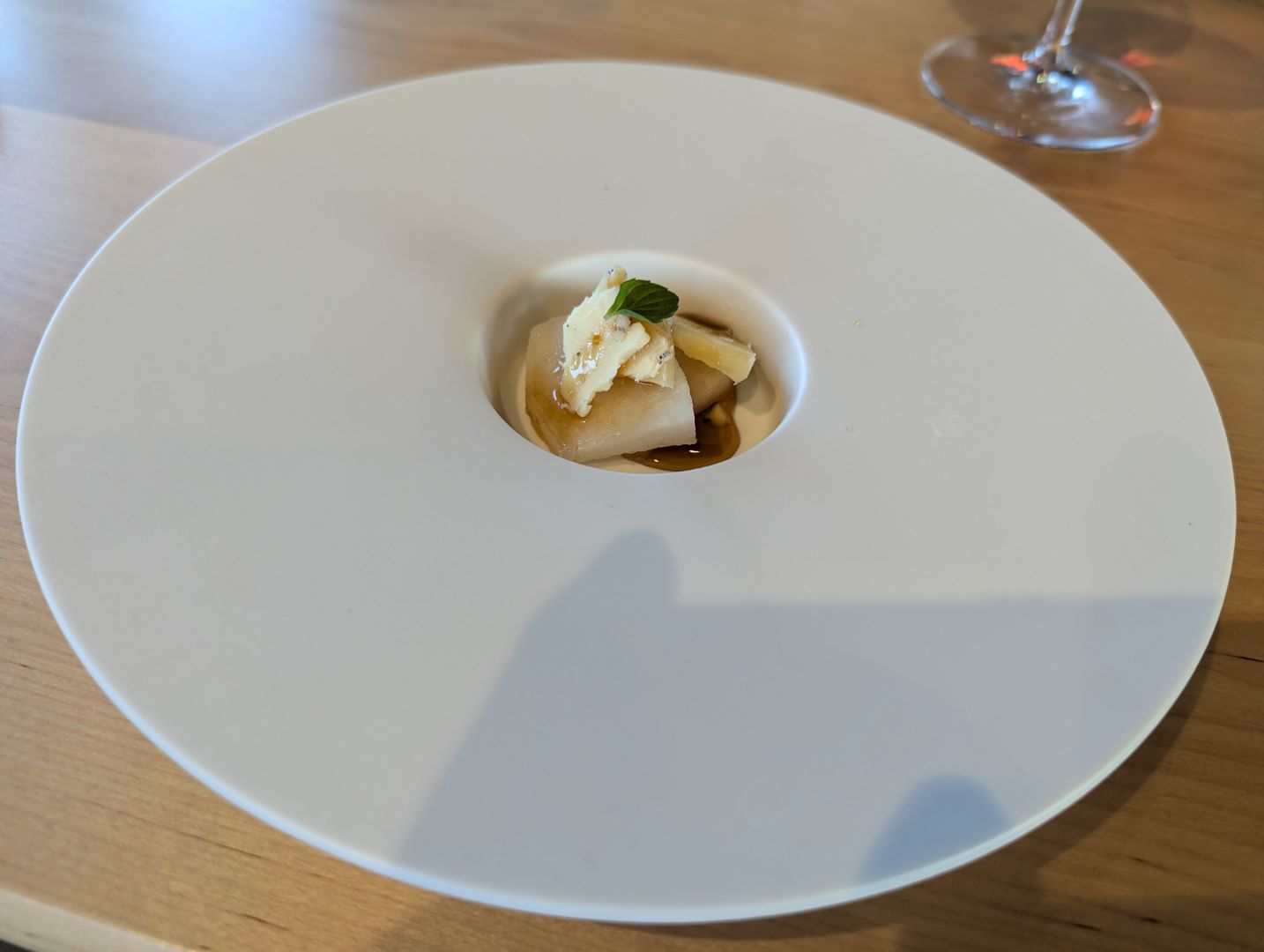 自分たちも移住を考えつつも10年ほど通い続けている東川。オーナー夫妻の佐野さんたちは2023年に移住されて、地元のこだわりの食材やワインを仕入れながら、また自分たちで目の前の畑でブドウも育てて将来的にはワインも作れないかなということも考えながらオーベルジュを始められたのだそう。こだわりの食材について色々とお話をしてくださる中で、自分たちも知っているお店や農場の名前が出てくるとちょっと嬉しくなったりも。また最後に出してくれたフォアグラ丼は、東川に来られる前の広尾のフレンチレストランのペリカンの人気メニューだったそう。