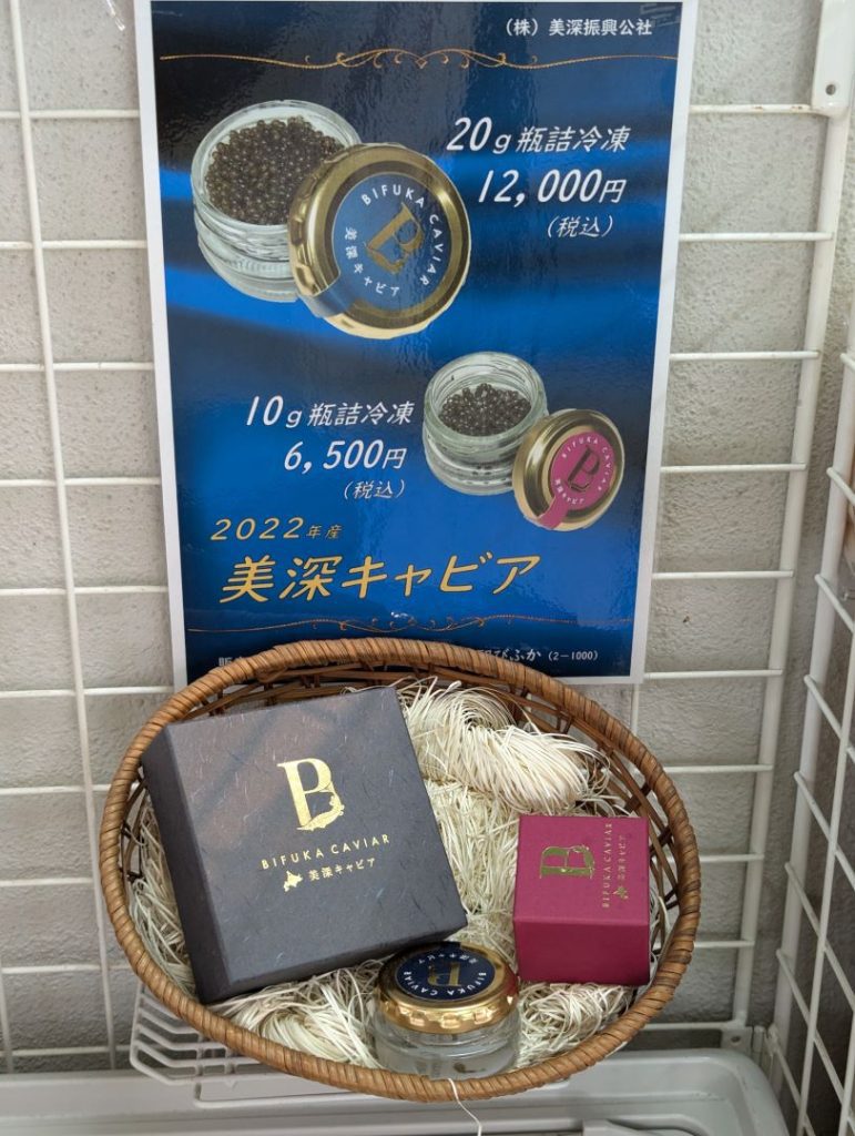 美深チョウザメ館がある美深アイランドという場所のすぐそばにある道の駅「びふか」に到着。中に入ってすぐの場所にさっそく見つけた美深キャビア。養殖の国産キャビアってそんなにたくさんは無いと思うのだけれど、こんな場所にあるのかとちょっとビックリ。