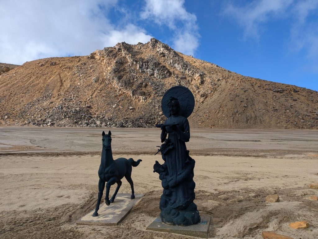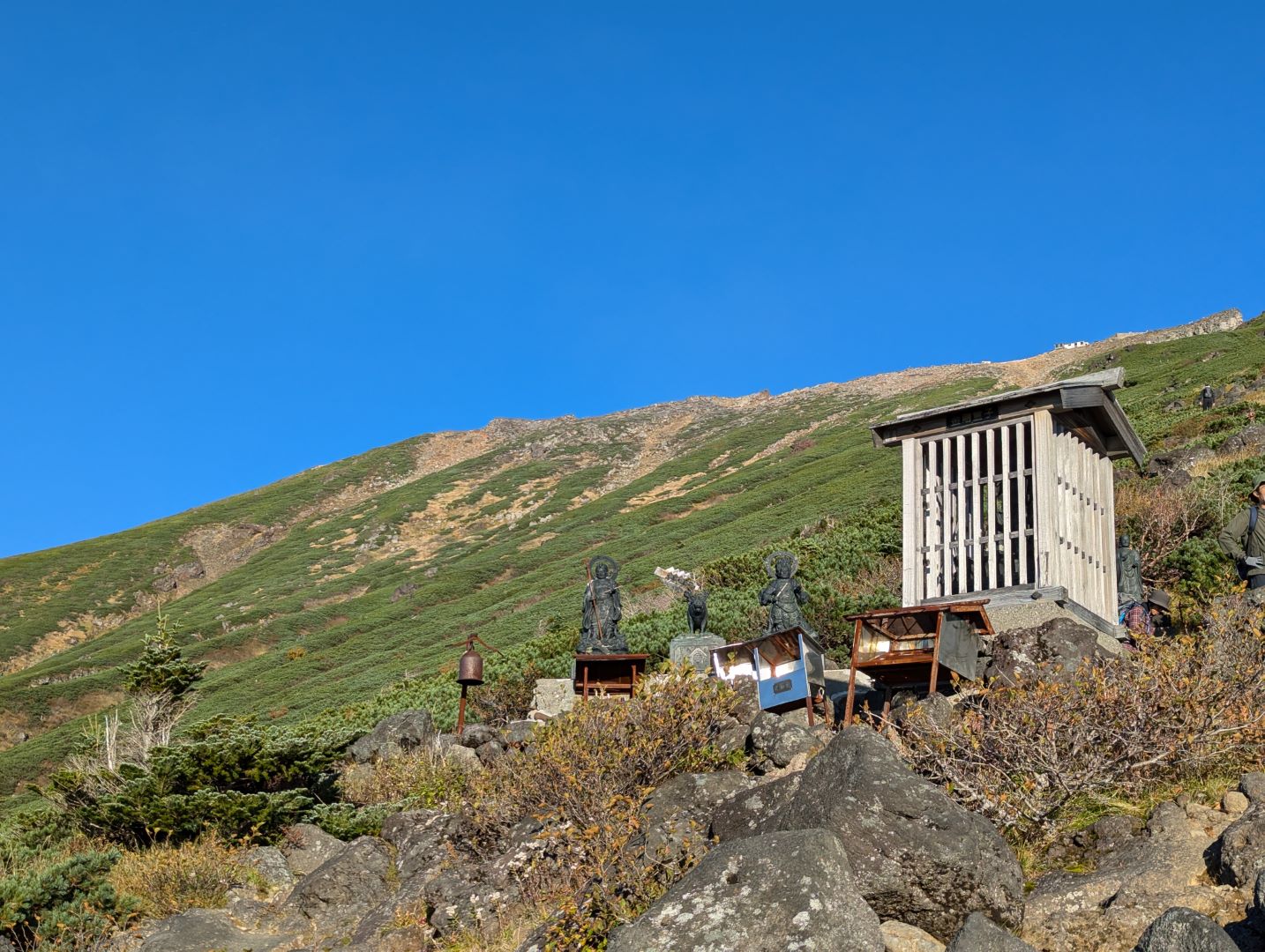 登山道には所々に仏像や祠があって、信仰の山であることを感じます。王滝村という名前と噴火による火山灰で一面灰色になっていた映像が頭に残っていたこともあって、真っ青な青空と緑の美しいこの風景が広がっていることに不思議な感じも受けました。