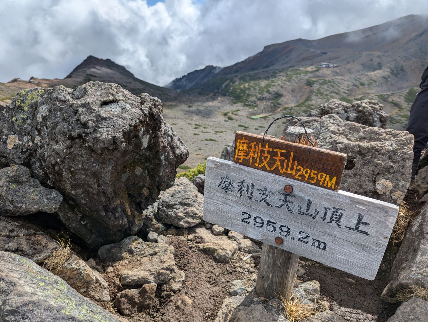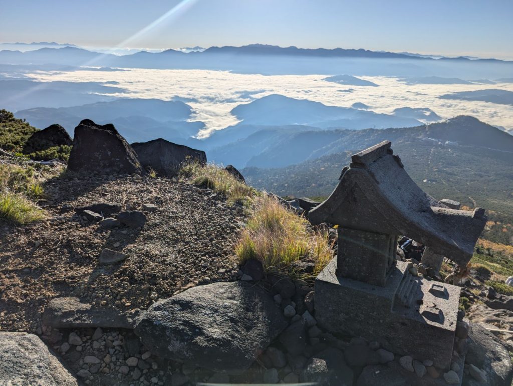 摩利支天山の山頂はとても狭くて、2-3人もいるとちょっとキツイなと感じる場所。恐る恐る山頂に立ち、賽ノ河原を下に眺めてその向こうに剣ヶ峰が堂々とそびえる景色を眺めましたが、なかなかのものでした。