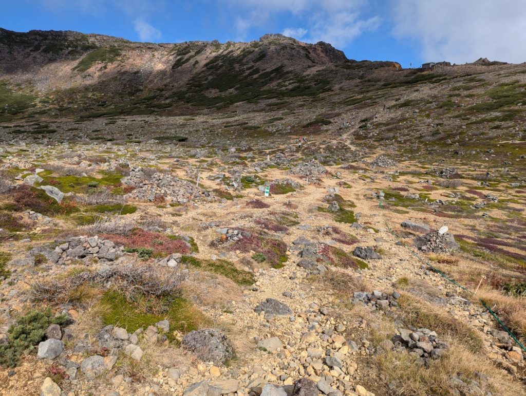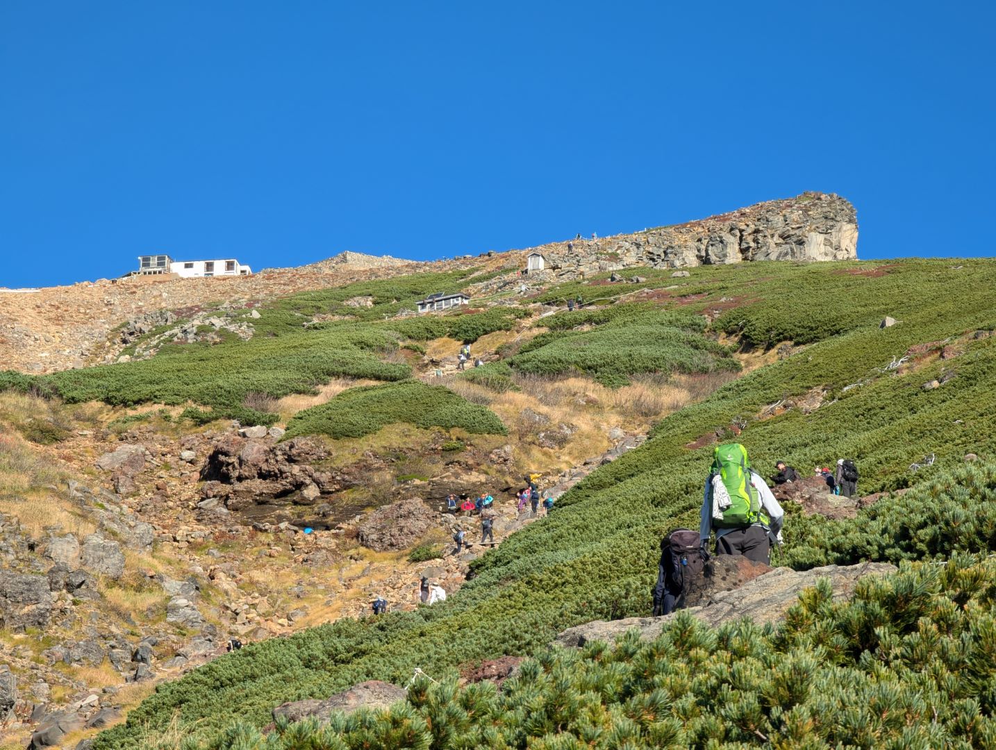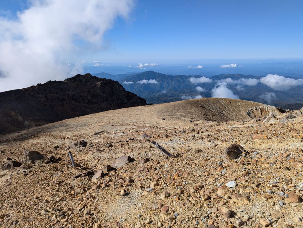 噴火の影響もあって登山客は少ないものかと思いきや、かなり多くの登山者が登山を楽しんでいました。一方で、普通この程度の登山道であればヘルメットはしないものですが、おそらく半数くらいの方がヘルメットを被って登山をされていて、自分も含めてだけど自然への畏怖がありつつ自然を楽しむみたいな気持ちを持つ人が多いものだなと思いました。