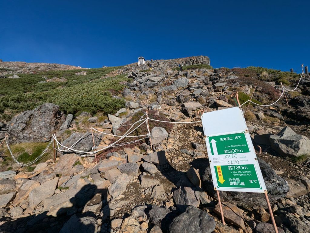 王滝頂上から剣ヶ峰へ至る八丁ダルミは、見ての通り遮るものが何もなく、噴火による噴石や噴煙に巻き込まれたらひとたまりもなかっただろうと想像します。今は、一応数十人くらい入れそうなシェルターが作られているものの(山頂下あたりに濃い茶色に写っているのと、右側のモニュメントの裏に少しだけ写っているアーチ型のもの)、八丁ダルミのあちこちに「足早に通り過ぎること」と書かれているように、ここは正直ちょっと怖かった。