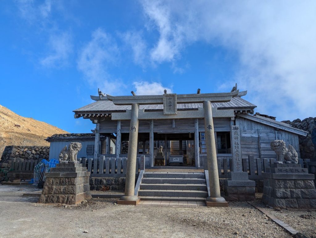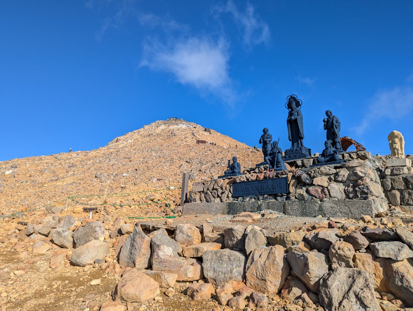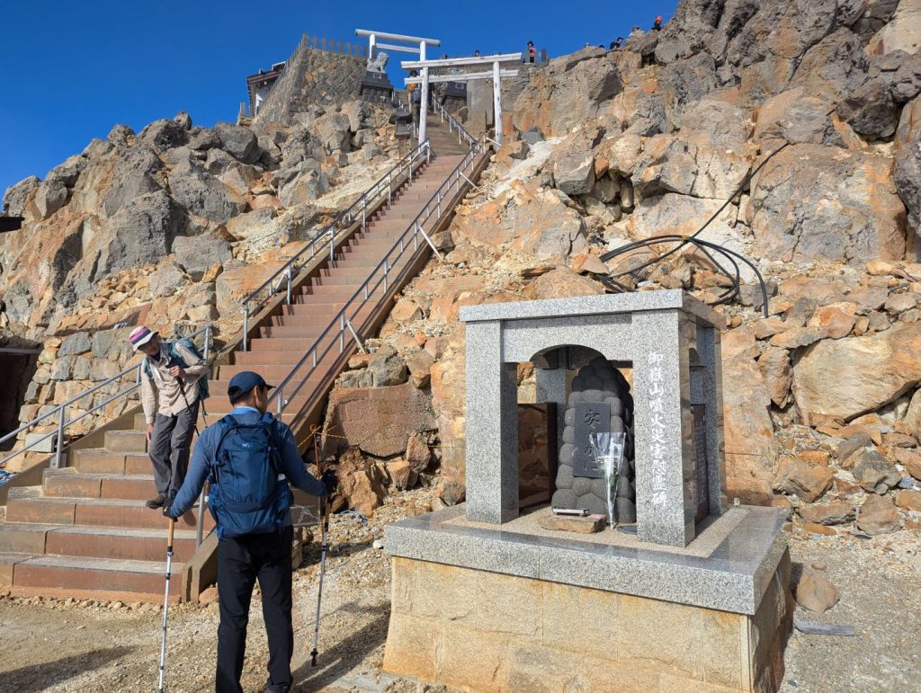 そんなわけで、急いで剣ヶ峰へ。剣ヶ峰直下には災害慰霊碑や真新しい避難シェルターが設置されていました。慰霊碑の前で長く祈りを捧げている方もいて、改めて当時のことを自分も思い出していました。