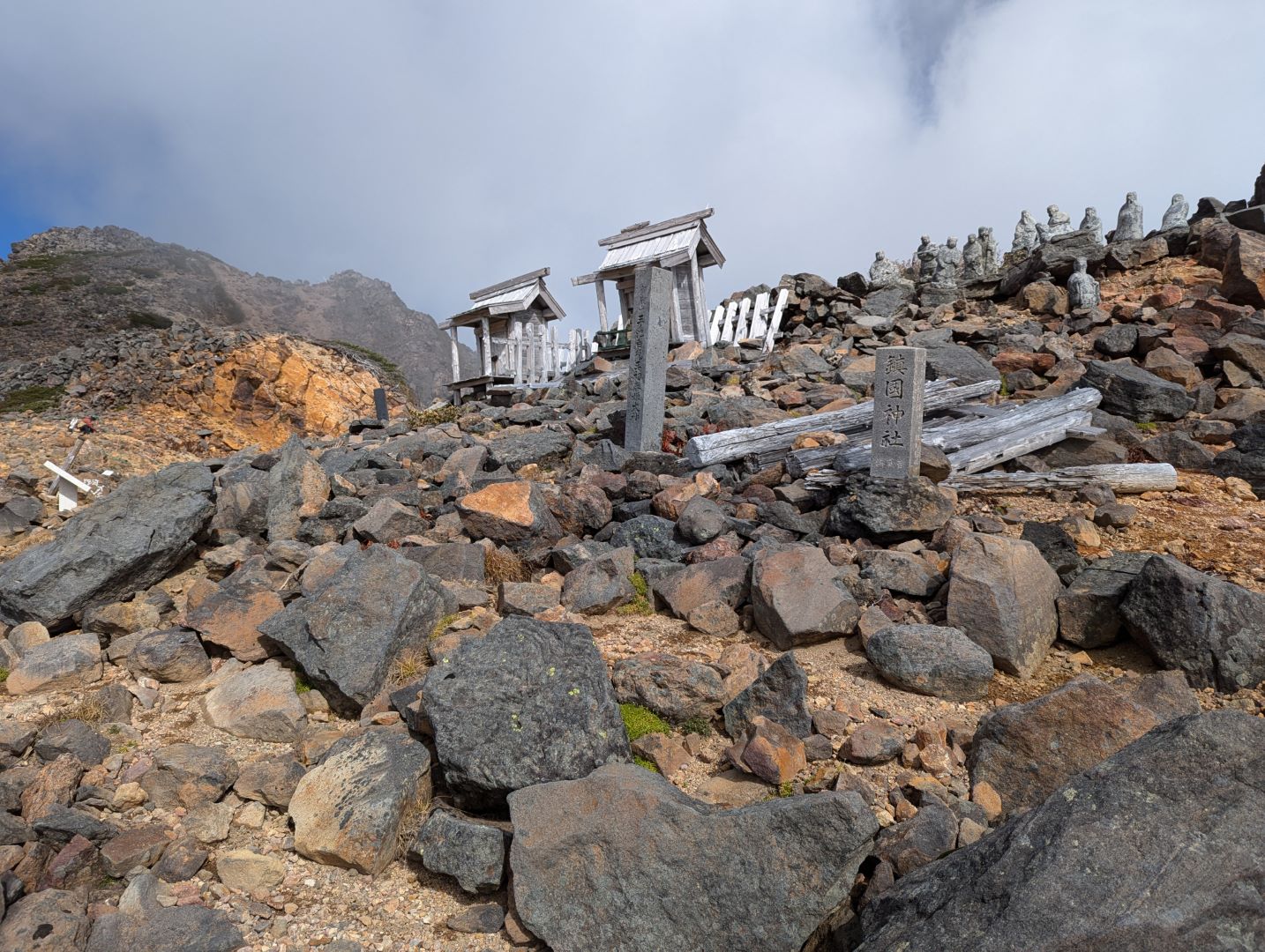 二ノ池をすぎると、平坦な場所に小さなケルンのように石が積み上げられた場所がいくつもある賽ノ河原へ。写真だと広がりがあまり感じられませんが、広大なエリアでちょっと異様な雰囲気が漂っています。その先にある鎮国神社も暗い時間帯には近寄りたくないなぁという雰囲気が…