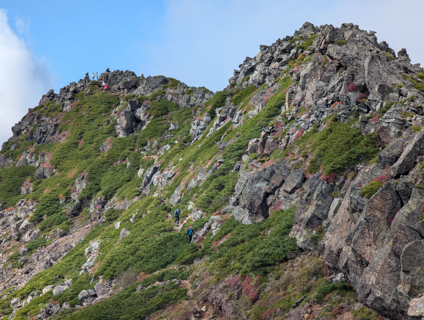 岩山をトラバースしながら山頂に近づく摩利支天山への道。望遠で見ていると、ナイフリッジのような山頂に人がいるけど、随分と狭そう。ここまでの道に比べると狭く険しいためか、剣ヶ峰に比べると登山者の数は全然少ない。