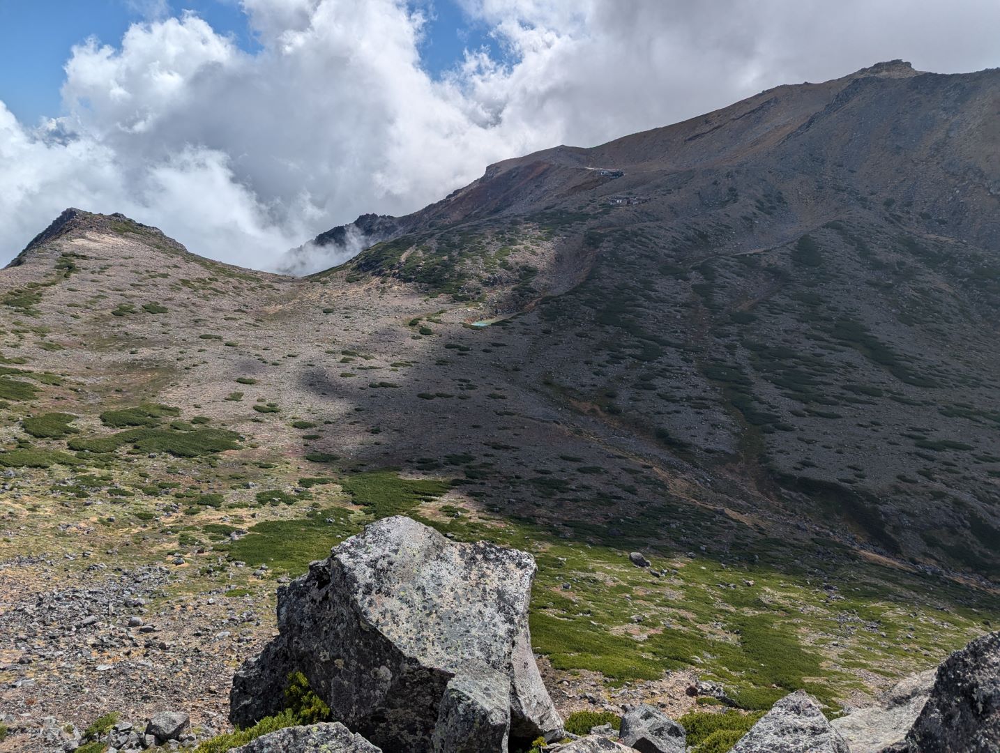登山ガイドブックに確かエメラルドグリーンの美しい池の写真があったよな、それが二ノ池だったよなというのが頭にあったので、その地名があれど池が見つからないのを不思議に感じていました。が、二ノ池山荘まで降りてきて感じたのは、おそらく火山灰で埋まってしまって水が干上がってしまったということ。帰ってから調べると、どうもつい最近完全に干上がってしまったようです。
