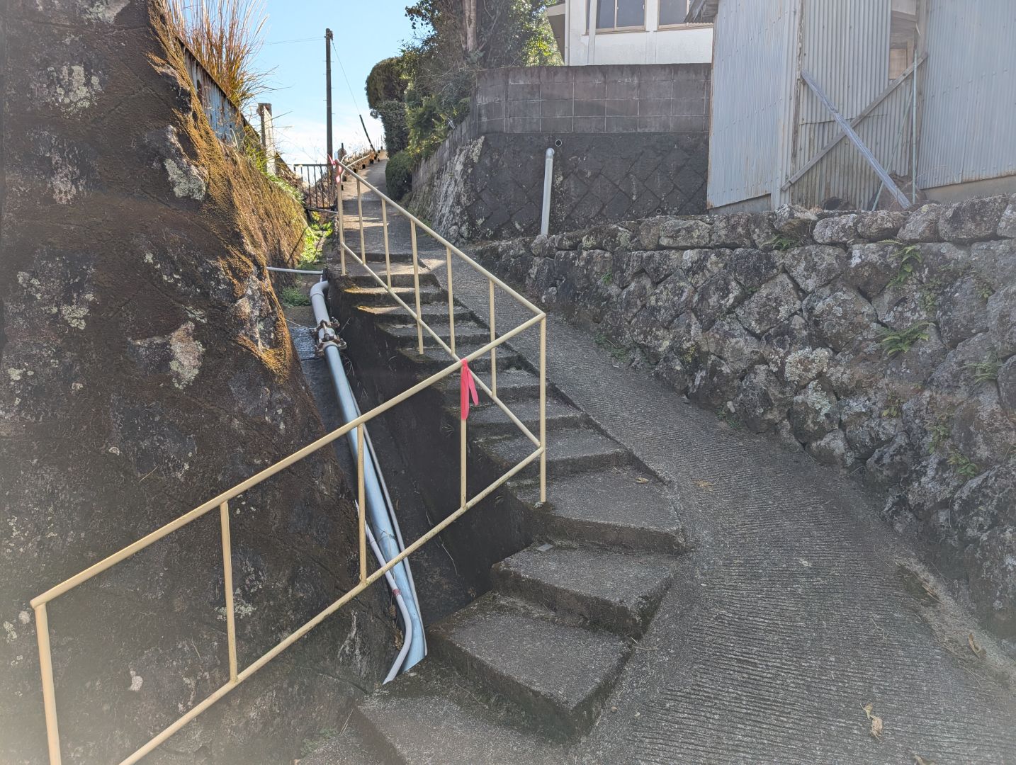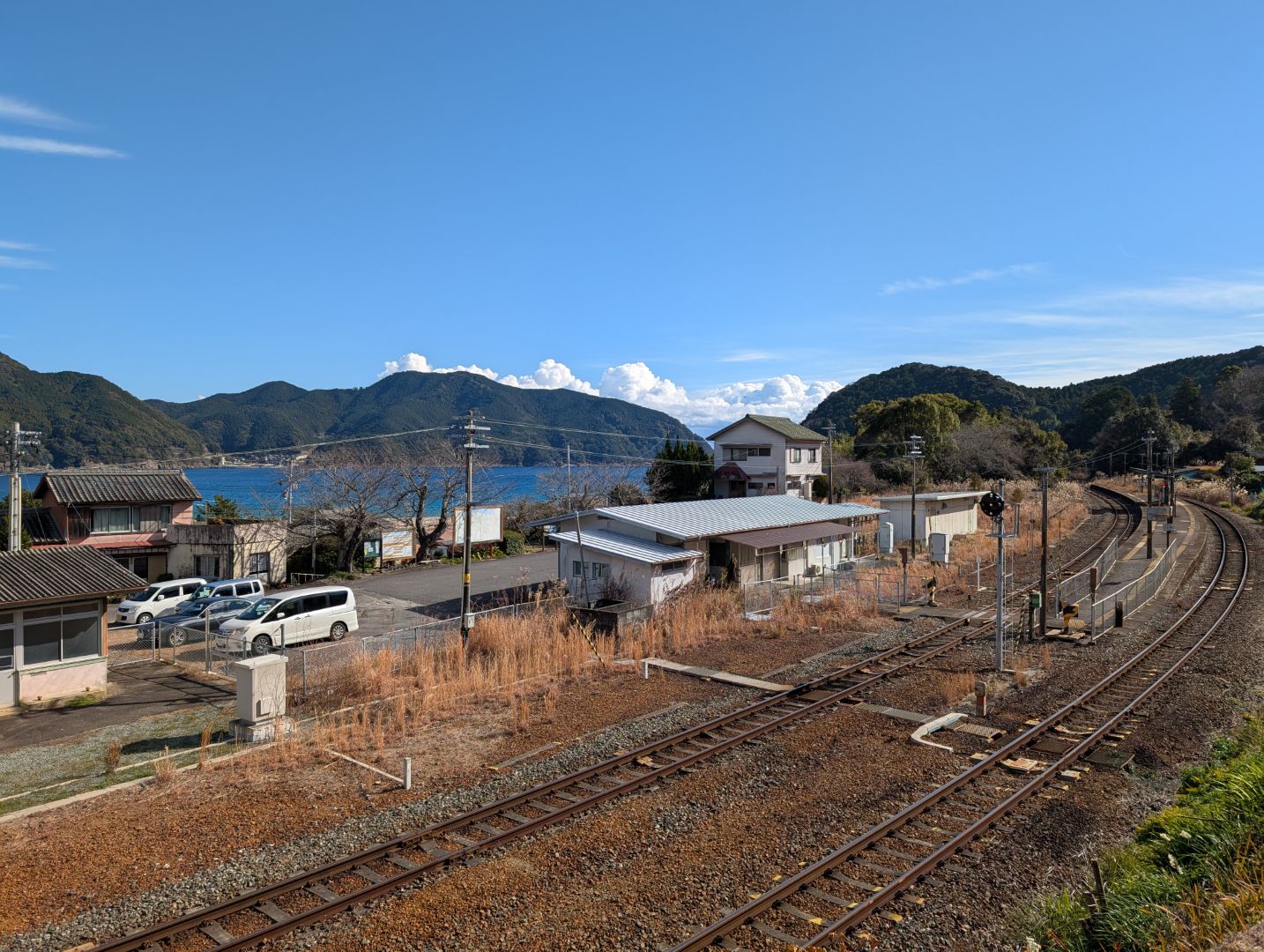 当時も小さくおそらく無人駅だったと思う新鹿駅。駅の裏手には高台へと続く小さな階段があって、これもやはり記憶に割と鮮明に残っていたので嬉しくなりました。思ったよりも急な道が続いていて、上の方までは行かなかった(狭くて急すぎて eBike で上がれず…)けれど、少し登った場所から見えたホームや海の感じはやはり脳裏にしっかり残っていました。