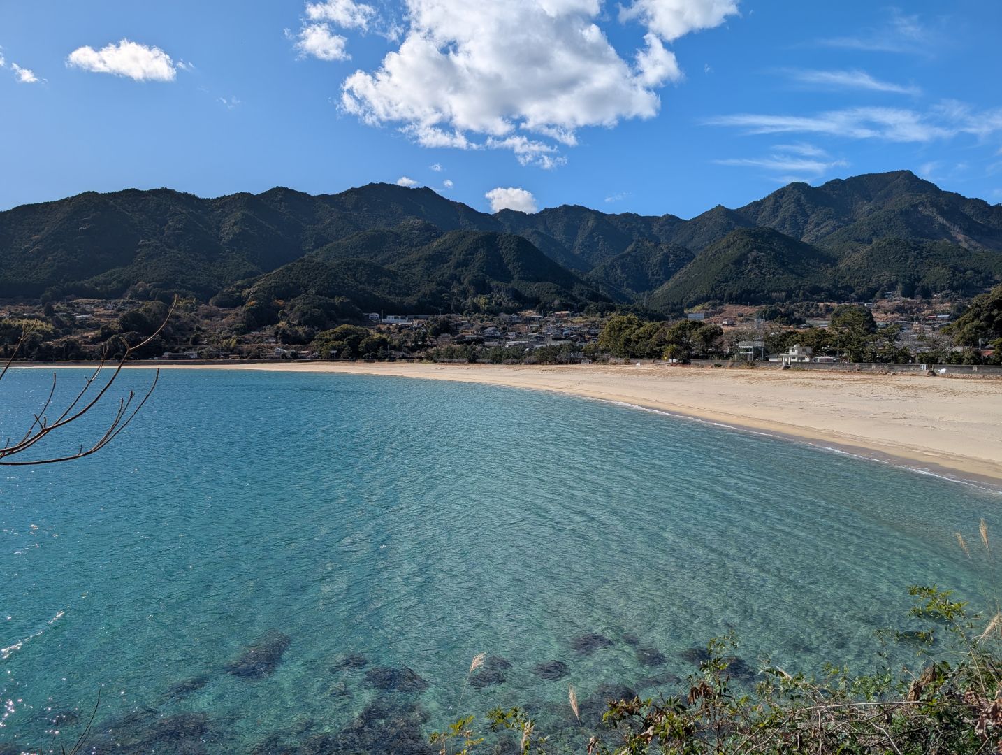 フェリーで約1時間の鳥羽から車で更に1.5時間程度。少し山側にある高速道路を降りてすぐに眼の前に広がった真っ青な海と白く弓なりの穏やかな砂浜は、自分の記憶の中にある景色とびっくりするほど一致しました。この砂浜で遊んだという記憶はないのですが、景色として見たことははっきり覚えていたのと、駅周辺の様子も記憶に残っていたので、早速車を止めて eBike で付近をちょっと散策してみることに。