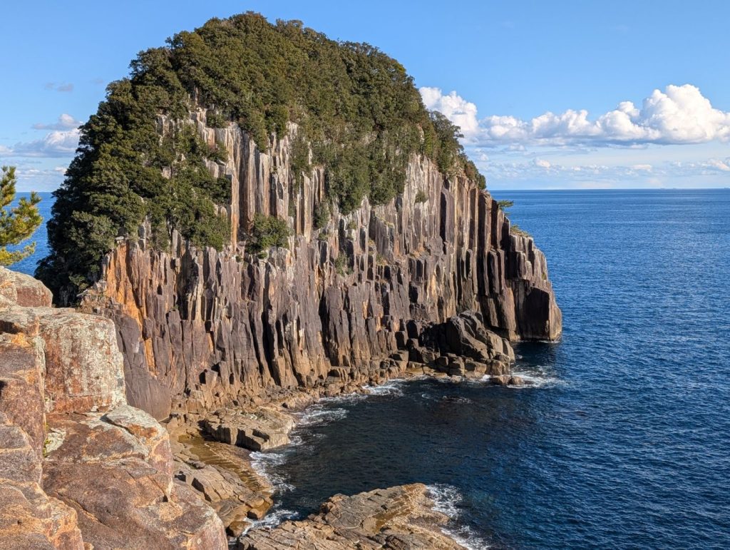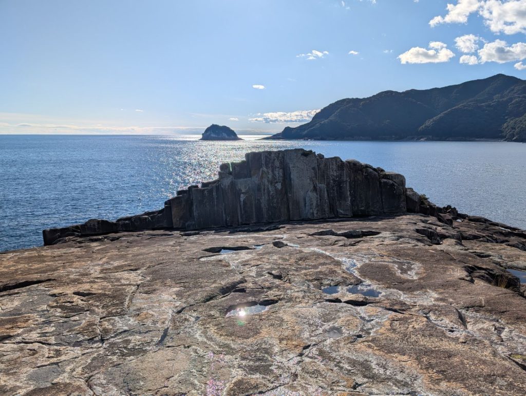 真っ青な海に突き出る形の小島全体が柱状節理になっている楯ヶ崎、なかなかの迫力です。この楯ヶ崎を眺める場所は大きく開けた千畳敷と呼ばれる岩場になっていて、それ自体も見どころと行って良いような場所でした。この楯ヶ崎や、近くには青の洞窟があって船から近づいてみるという方法もあるようなのですが、予約が必要なようだし今回はサイクリングということもあって断念しましたが、次回があれば青の洞窟を見ることも兼ねて海側からアプローチしてみたいものです。
