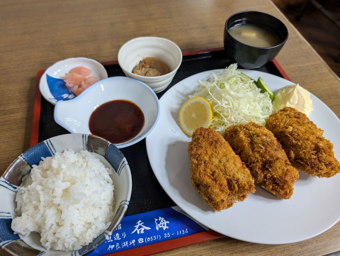 最終便のフェリーで伊良湖に戻ってきたらすっかりお腹が空いてしまったので、伊良湖港近くの呑海というお店に入ってみました。最初はこのあたりで有名な「大アサリ」の定食を食べようかと思ったのですが、店主が大アサリは取れなくなって高いのと、ここのこの時期の名物はカキだからということで、カキフライをおすすめされたので大アサリを諦めてカキということで。3個入と5個入とどっちにすると言われて3個入を頼んでおいて良かった…この一つのフライに3-5個くらいカキが入った超巨大なカキフライでしたが、揚げたてアツアツのジューシーで味もとても濃厚なカキフライで大満足。これを食べにわざわざこの店に来る人がいるというのも納得の一品でした。