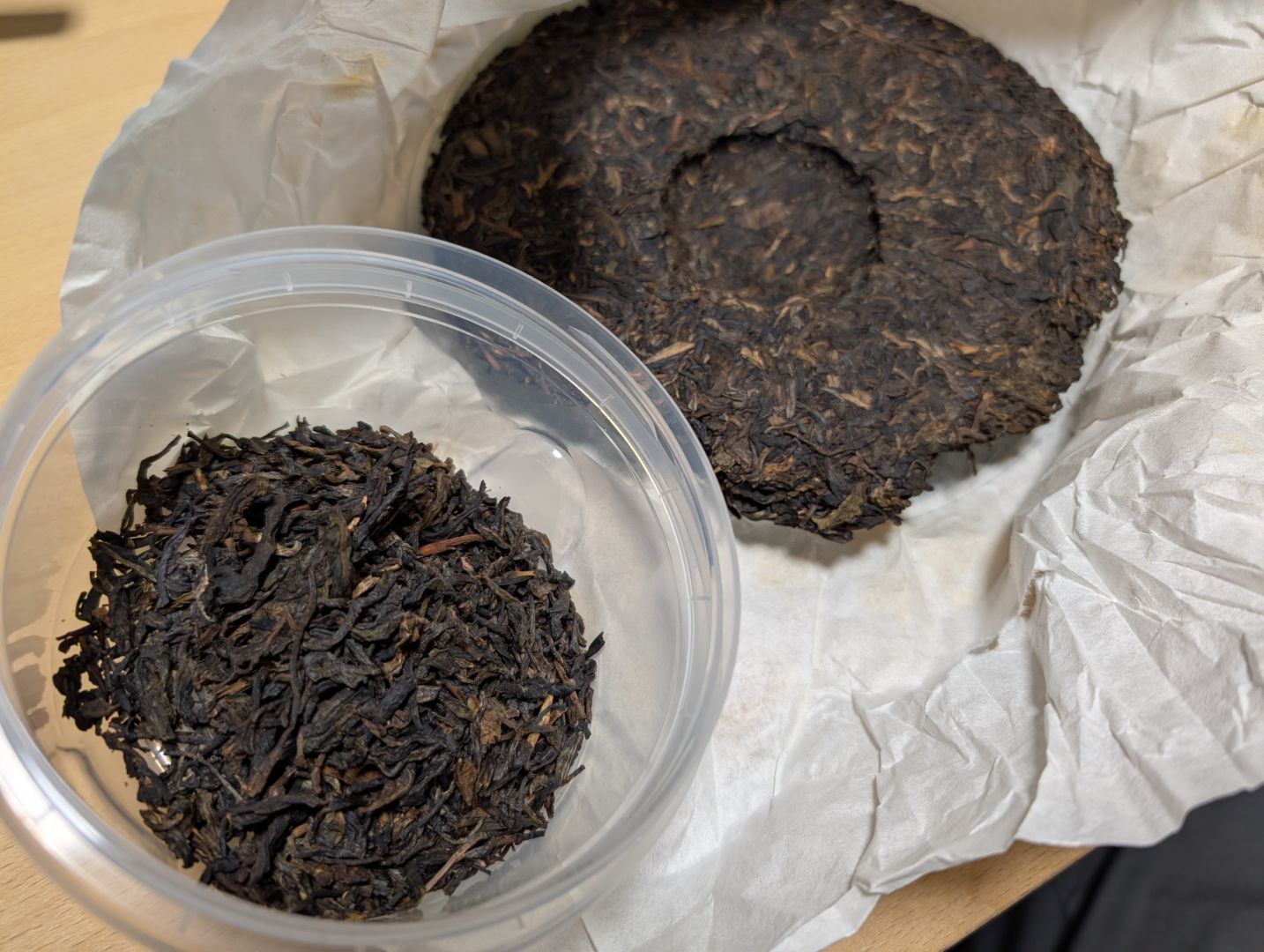 中国に旅行をしたときにも、確かこういう大きなお茶が売っていたのは覚えていたのですが、これがどういうものかを全く知りませんでした。今回お土産としていただいて、調べて初めて知ったのですが、このように固く円盤状に加工されたものを餅茶というそうで、圧縮していることもあって酸素に触れにくく熟成させながら楽しむこともできるみたいです。