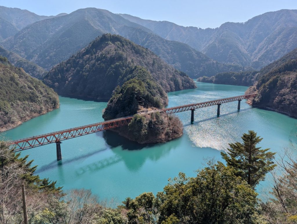 有名な奥大井の湖上駅。この景色を見ることができる展望台は湖上駅で降りて登ってくると、そこそこ大変なはずなのですが、車道側から自転車だと割と楽にアプローチできていい感じです。この日は暑いくらいの陽の光にエメラルドグリーンの湖面がキラキラしていて、なかなかの絶景でした。このエメラルドグリーンに赤い列車のコントラストが良い感じです。