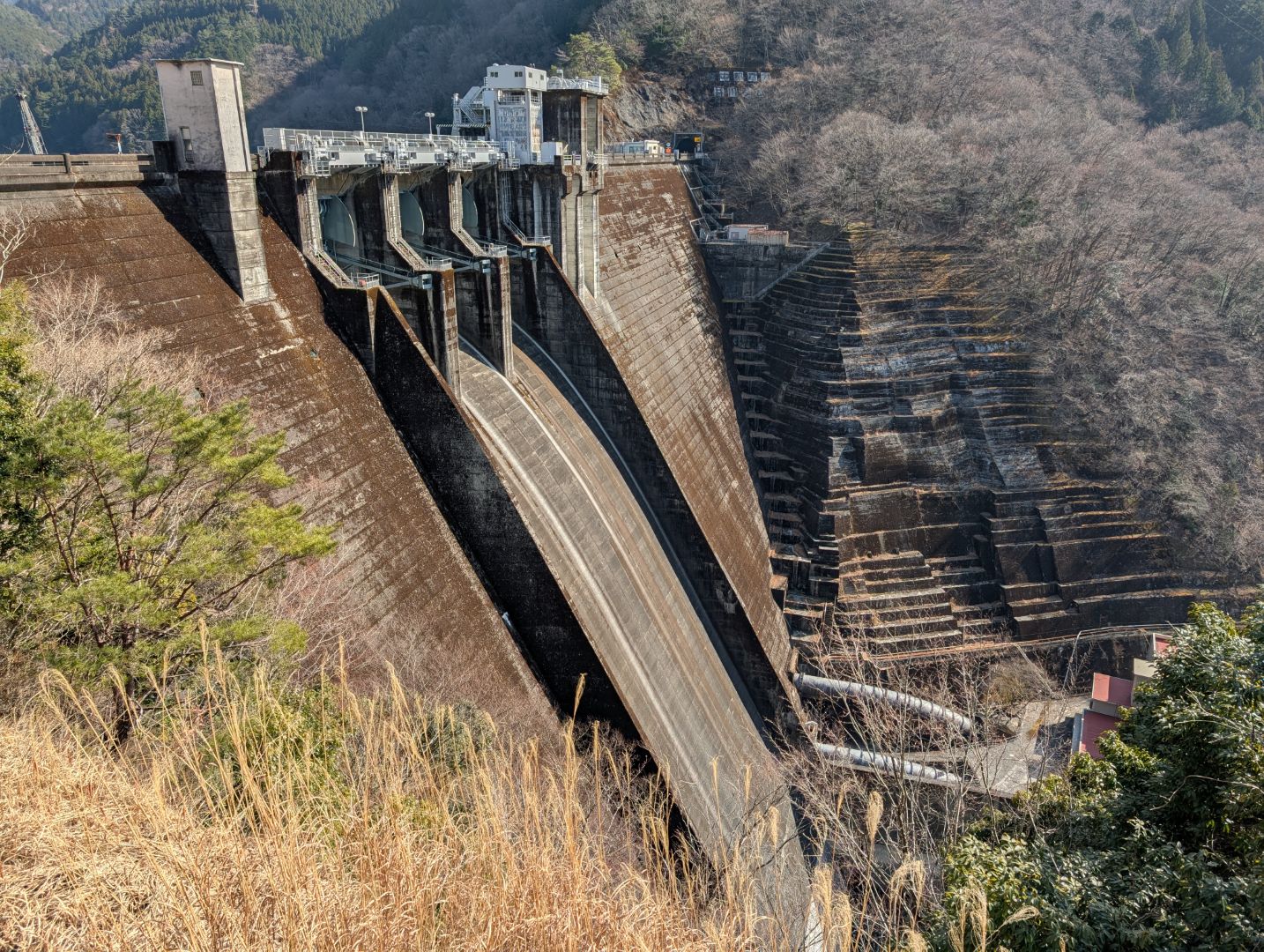 接岨峡温泉会館の先で、接岨トンネルを進む道と大井川沿いに進む細い道に分岐していて、長いトンネルを自転車で行くのが嫌だなというのと、川沿いの景色を見ながらサイクリングしたいなというのもあって、細い道を川沿いに進んでみました。井川線の関の沢橋梁を遠くに見ることができる展望台まで来たところで、その先が土砂崩れで通行止めになってて引き返すことに…分岐場所に通行不可であることを書いておいてほしい 苦笑。