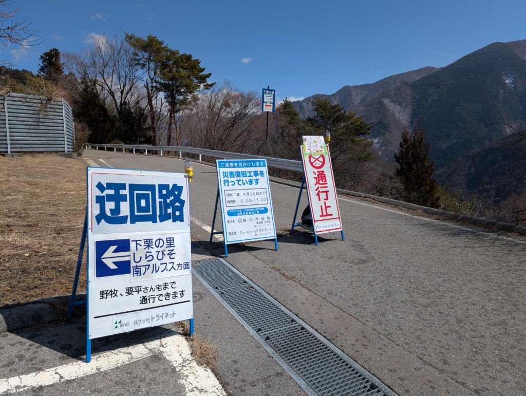 来たことが無いのに見覚えがあるような道だなと思っていたら、以前行ったことがあるしらびそ高原へと抜けることができる道でした。ここはまだ冬季閉鎖中で通ることができません。で、南アルプスエコーラインに入り目的地付近に到着できたのですが、展望台に至るそれらしき道や案内が全くありません…おかしい。