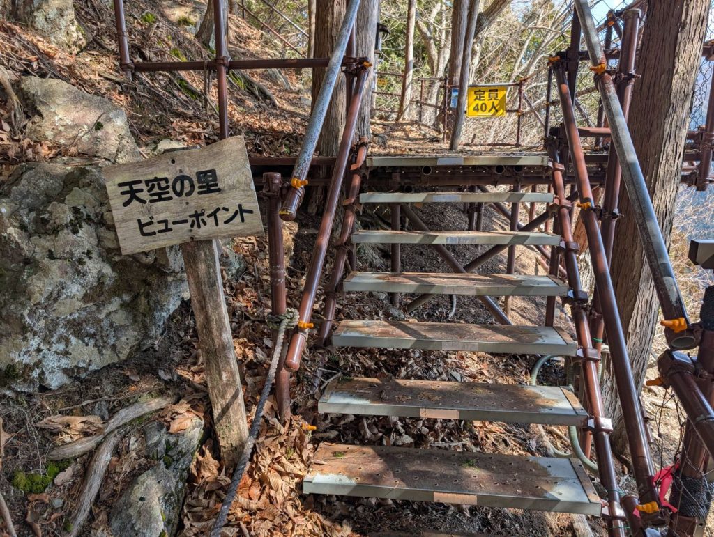 かなり狭い遊歩道ではありますが、しっかりと作られていて 10-15分ほど歩くと、天空の里ビューポイントに到着しました。山にはまだ雪が残るような時期でもあったためか、この日は誰もいませんでした。