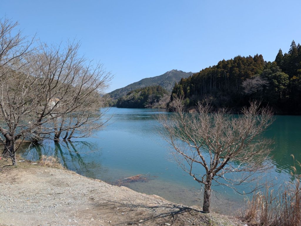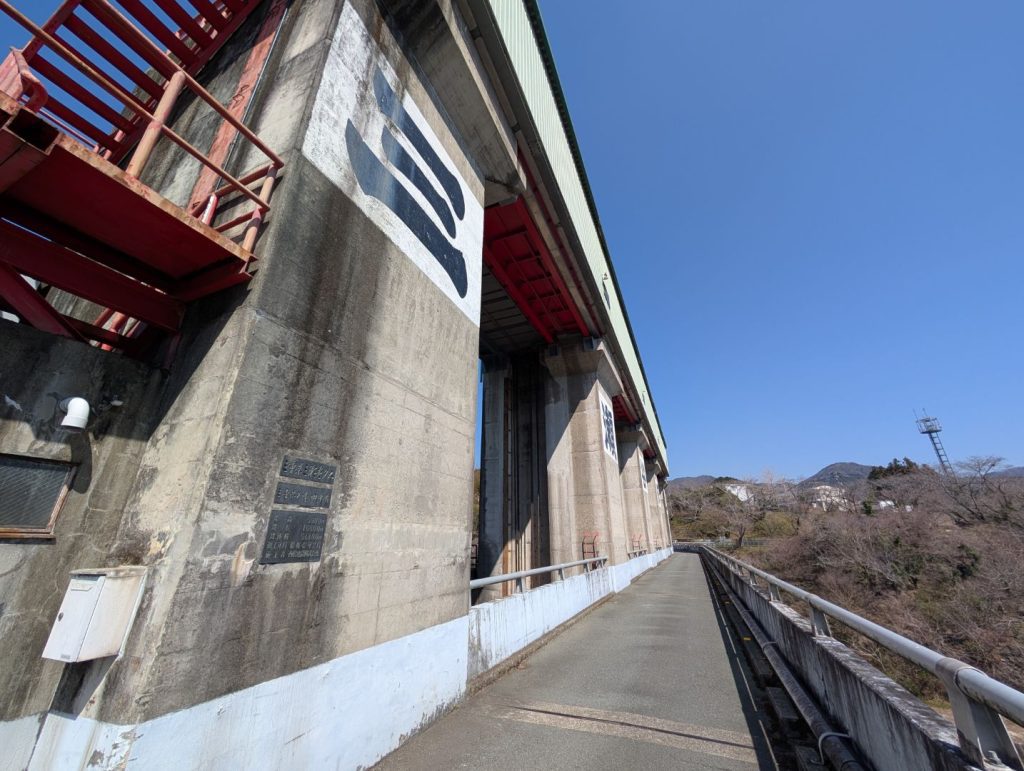 走り始めてすぐに見えてくるのが三瀬谷ダム。ダムの建造物に巨大な「三瀬谷ダム」の文字が貼り付けてあって、ダム自体はそこまで大きくないのに妙に迫力が感じられて面白い。エメラルドグリーンの水を湛えるダムや建造物を見ると気持ちが高揚するのが不思議。