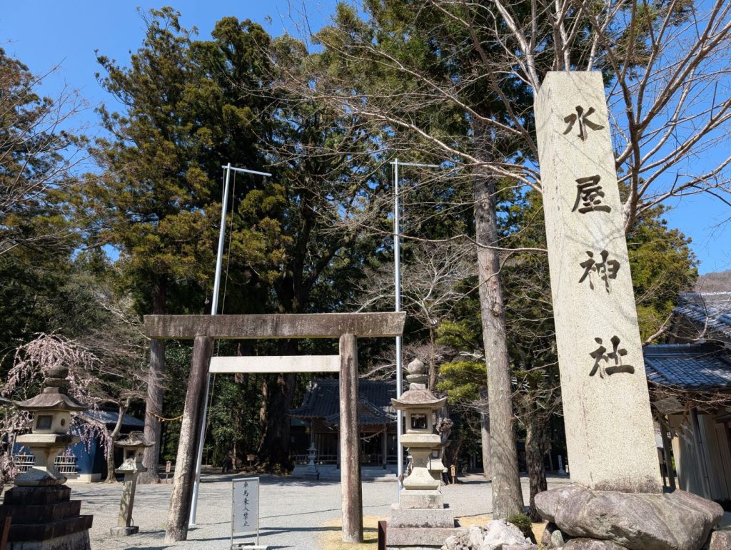 鳥居が写っている写真の真ん中に、「車馬乗入禁止」と書かれた立て看板があったのですが、ふとその裏側に「織田信長軍 vs 北畠具教軍 敵味方鎮魂祭 地球平和祈願祭」とあり、なんだろうコレと。織田氏と北畠氏は織田の伊勢攻略にあたって戦っていたので、その両軍で亡くなった方の鎮魂祭ということなんだろうかと…水屋神社にあった神社の由来などにはこれに関する表記がなかったので気になりました。